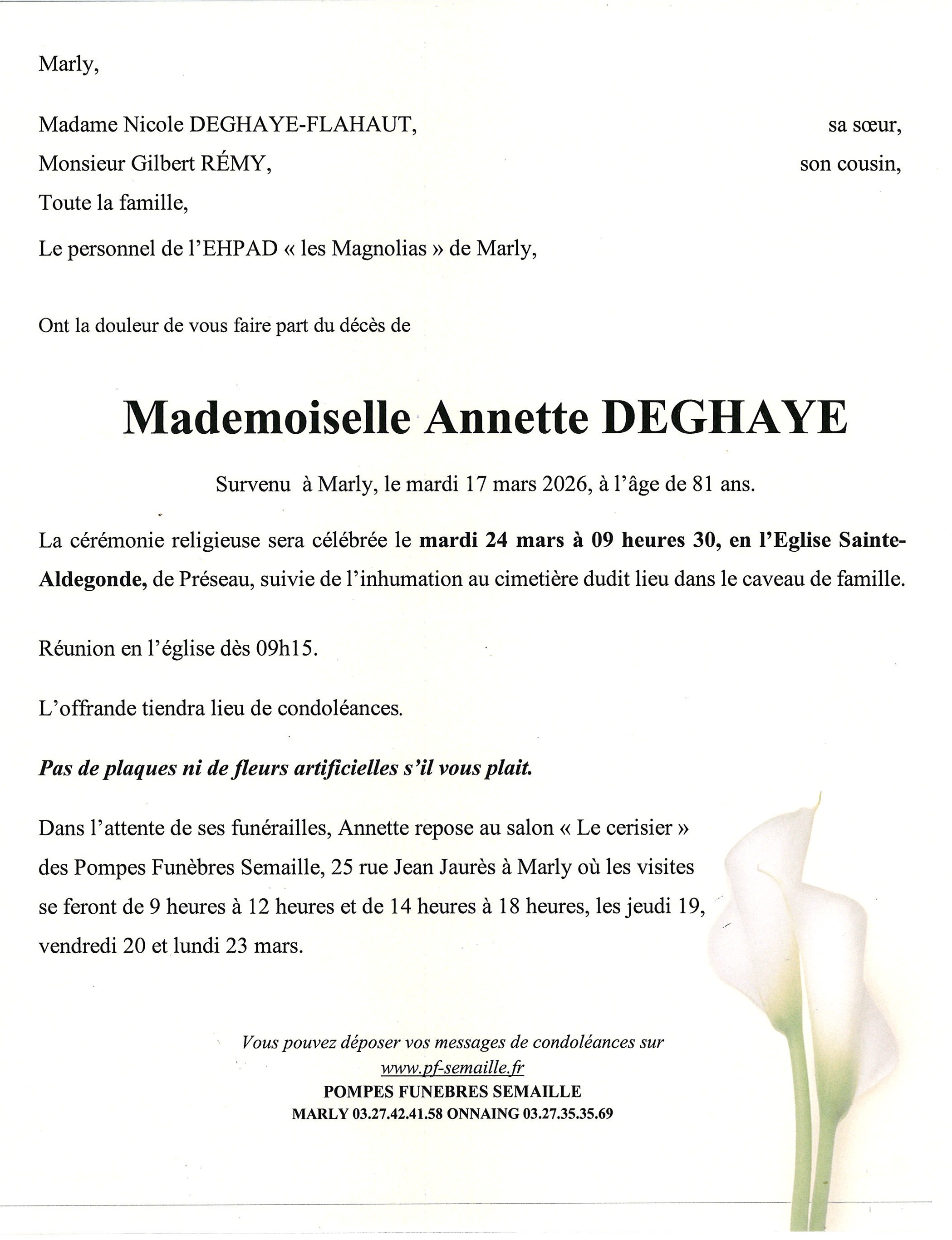 Avis de décès de Annette DEGHAYE