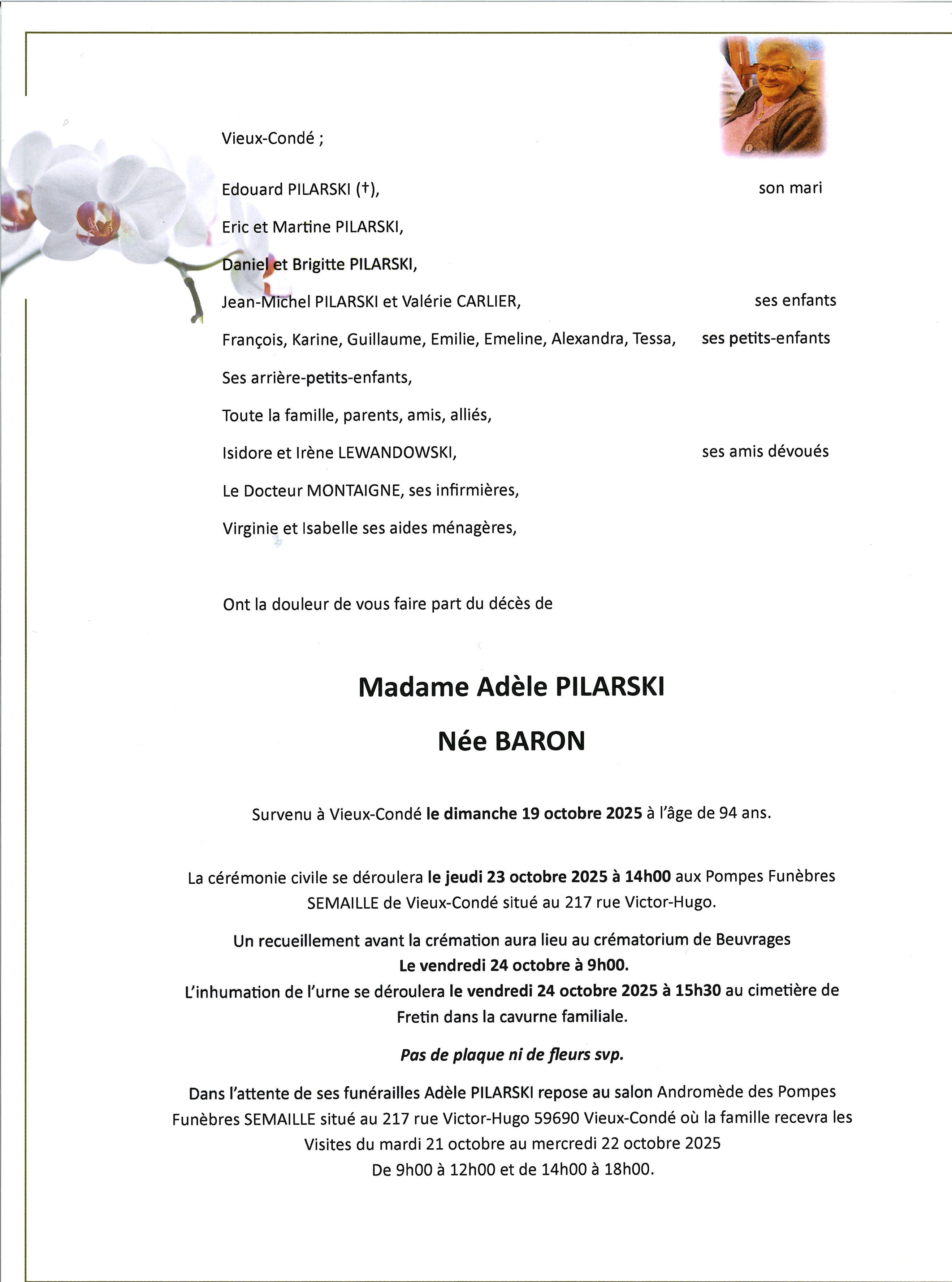 Avis de décès de Madame Adèle PILARSKI née BARON