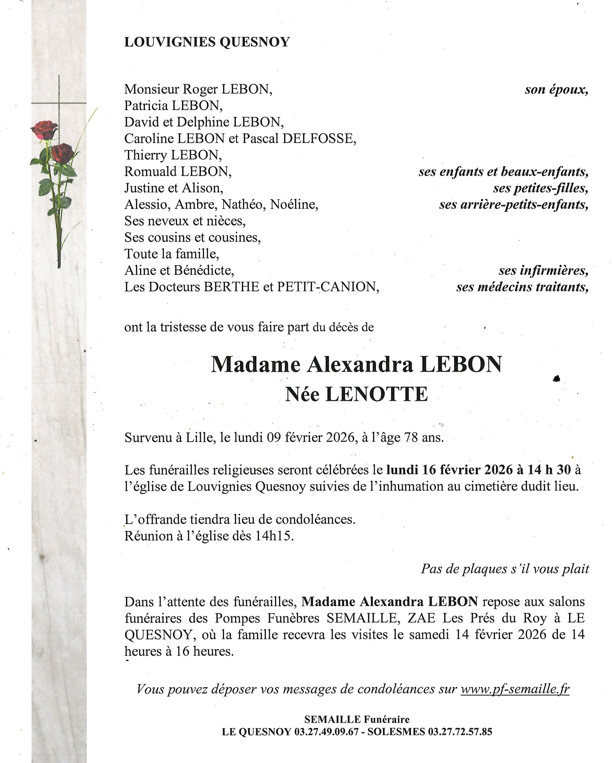 Avis de décès de Madame Alexandra LEBON née LENOTTE