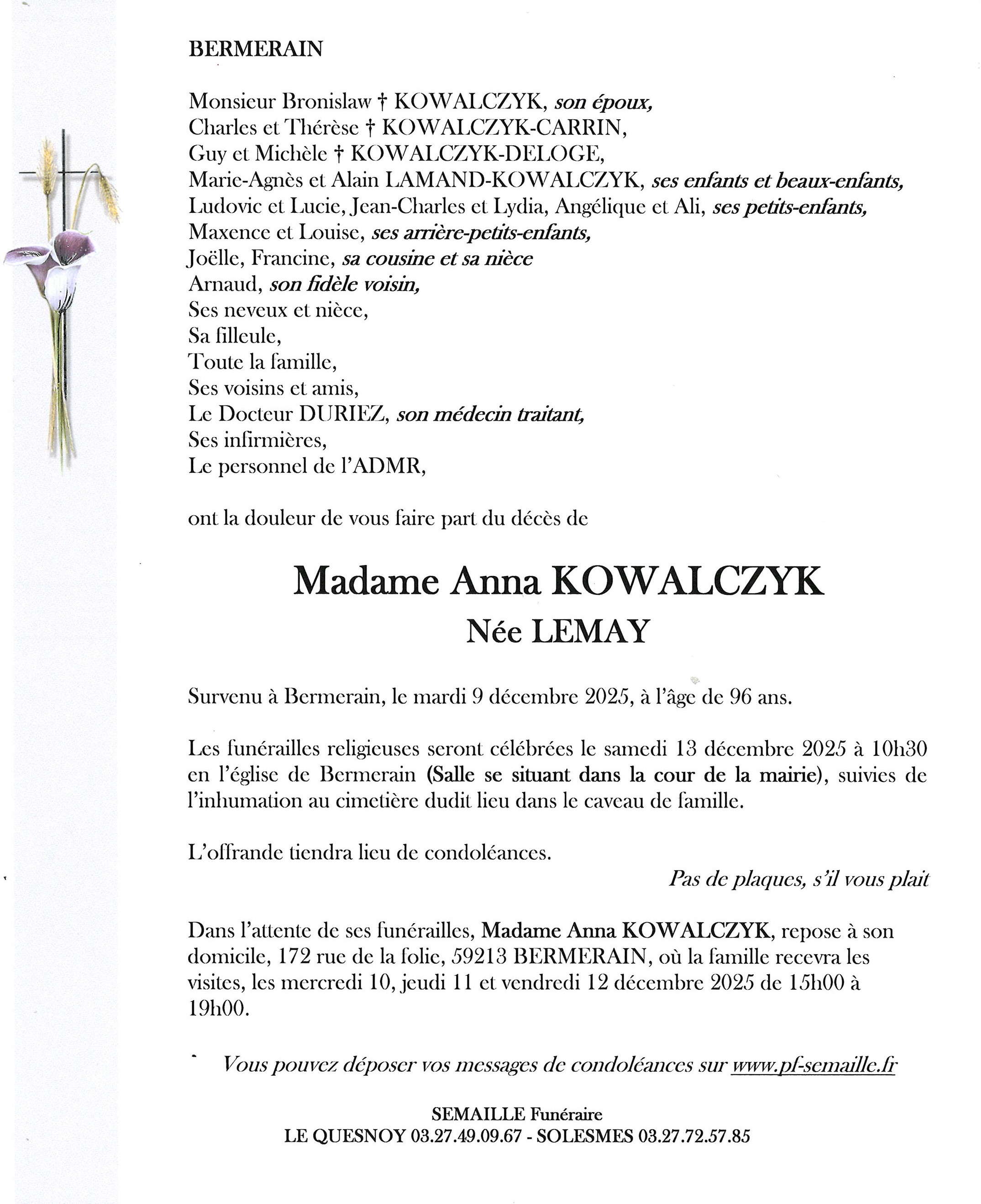 Avis de décès de Madame Anna KOWALCZYK née LEMAY