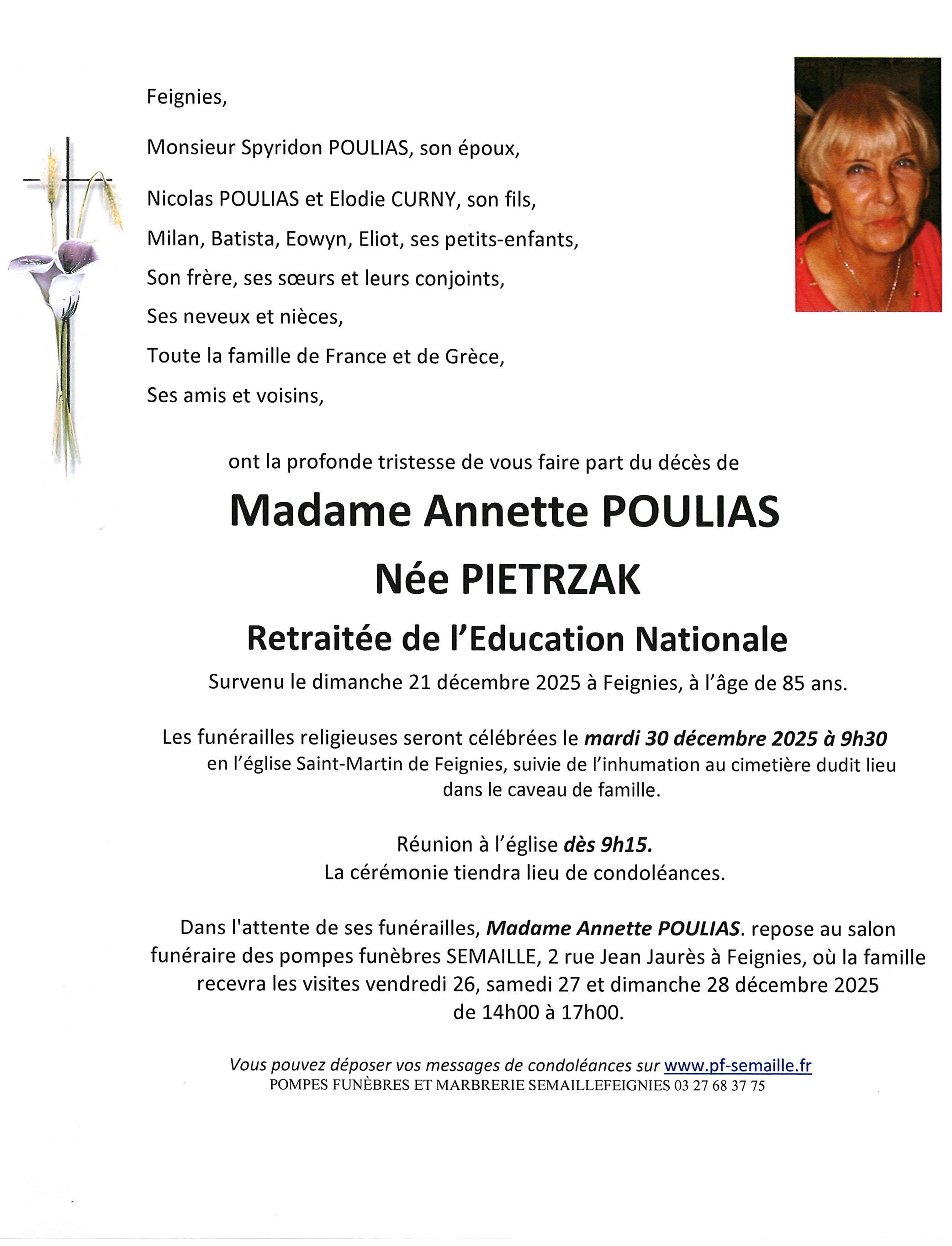 Avis de décès de Madame Annette POULIAS née PIETRZAK