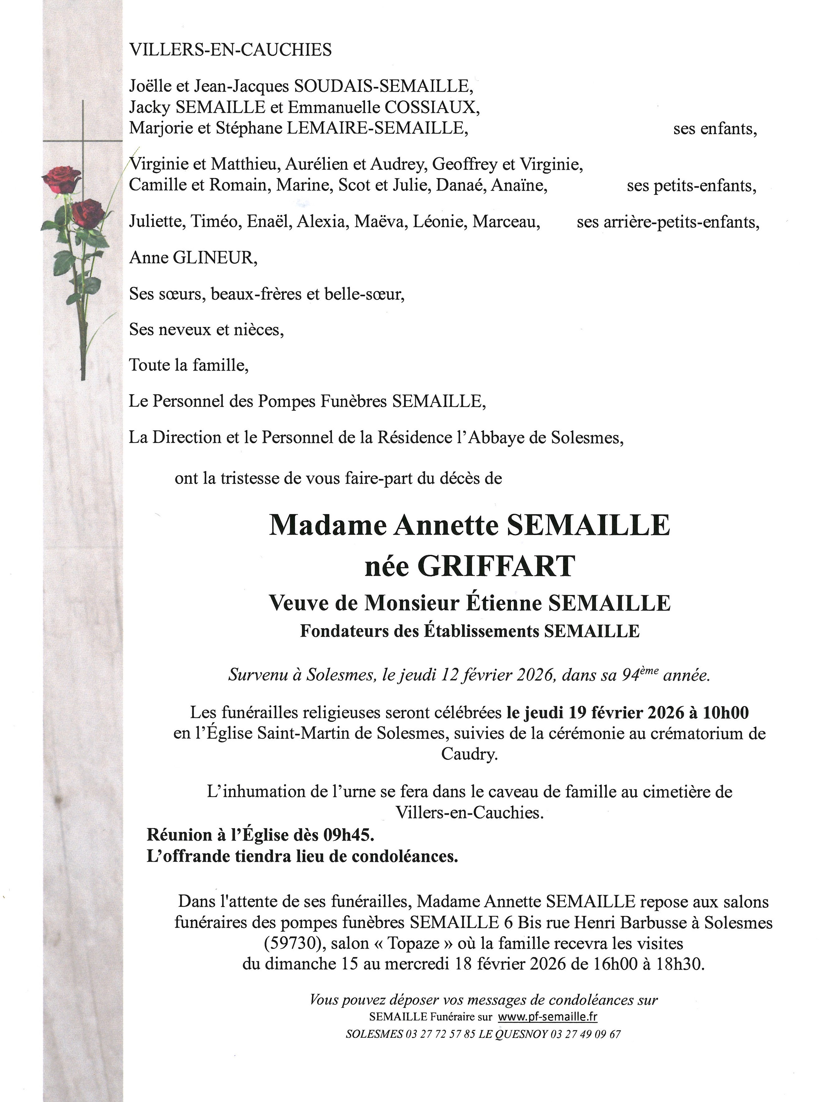 Avis de décès de Madame Annette SEMAILLE née GRIFFART