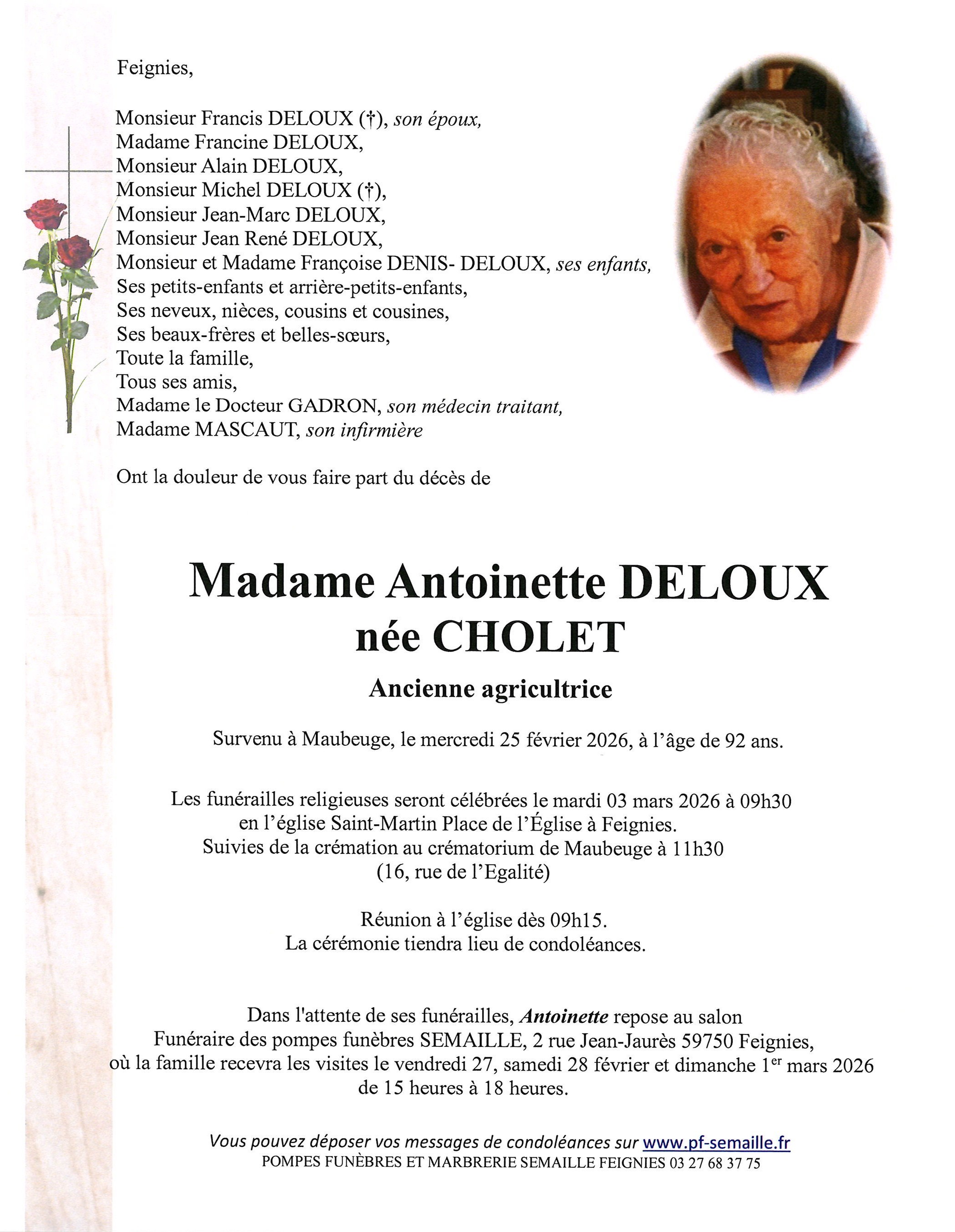 Avis de décès de Madame Antoinette DELOUX née CHOLET