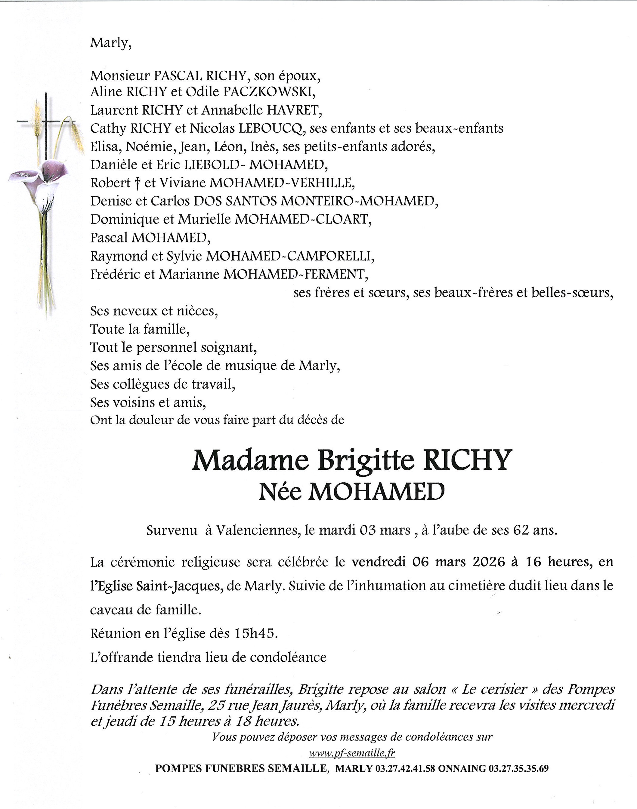 Avis de décès de Madame Brigitte RICHY née MOHAMED