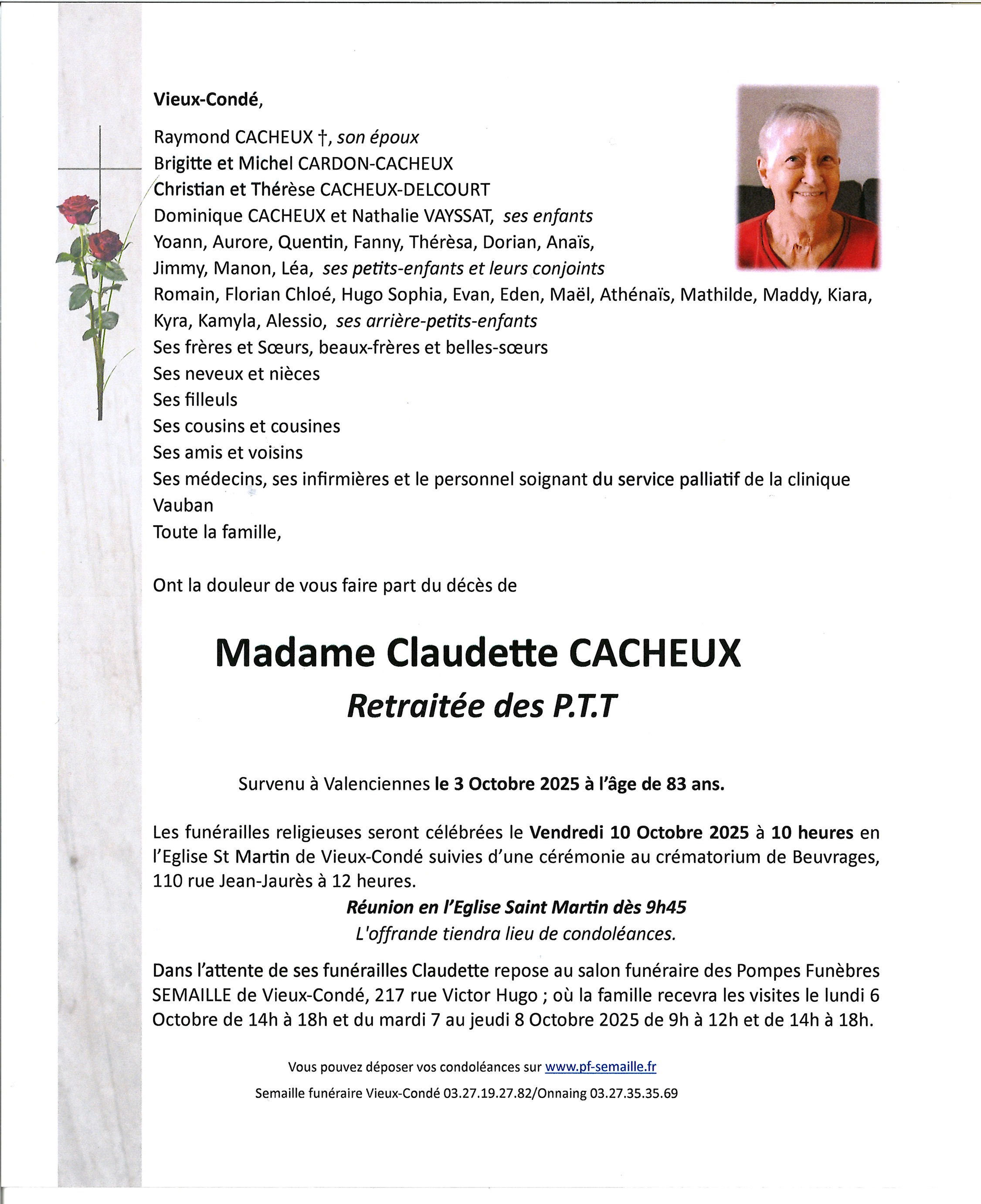 Avis de décès de Madame CLAUDETTE CACHEUX née CROUTELLE