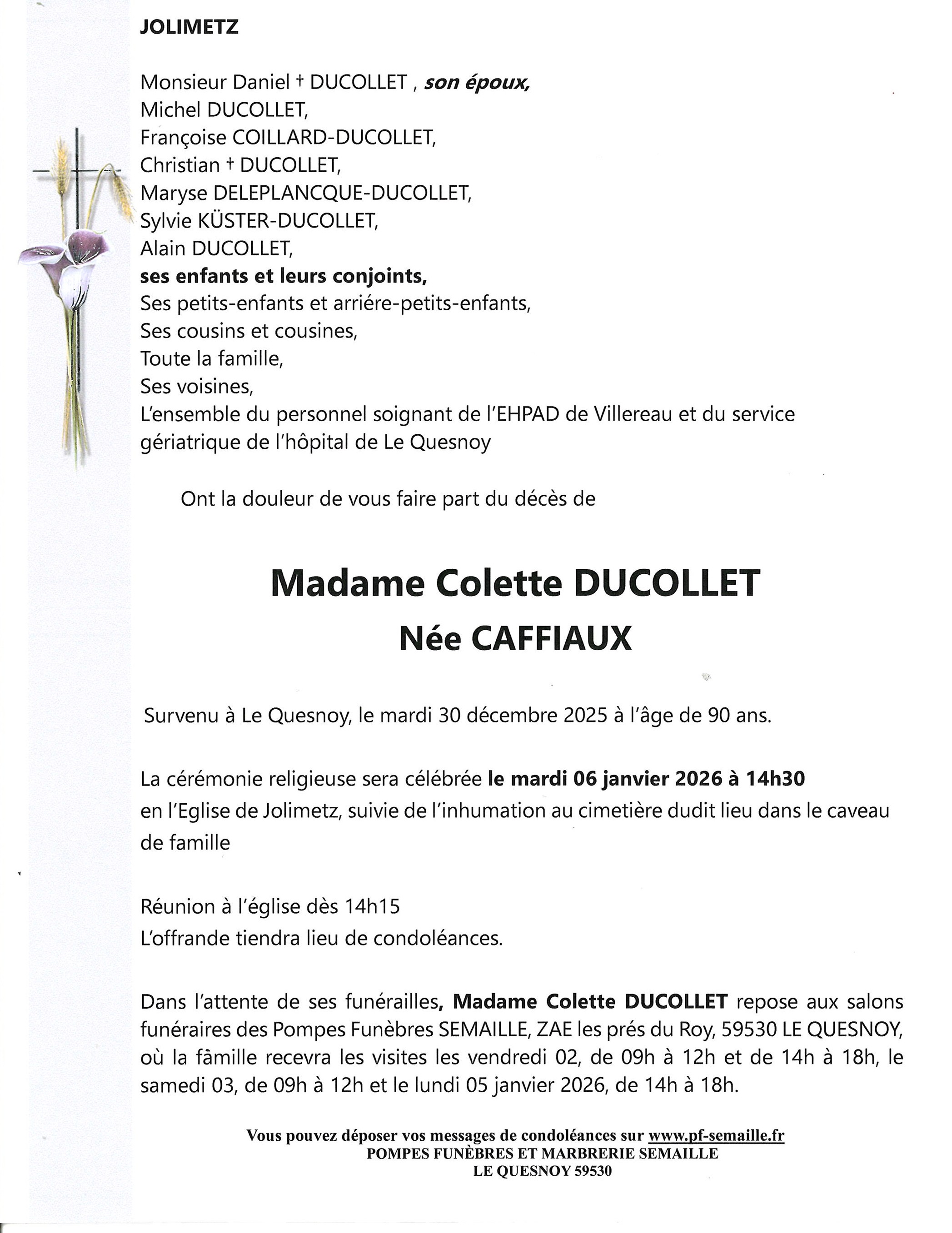 Avis de décès de Madame Colette DUCOLLET née CAFFIAUX