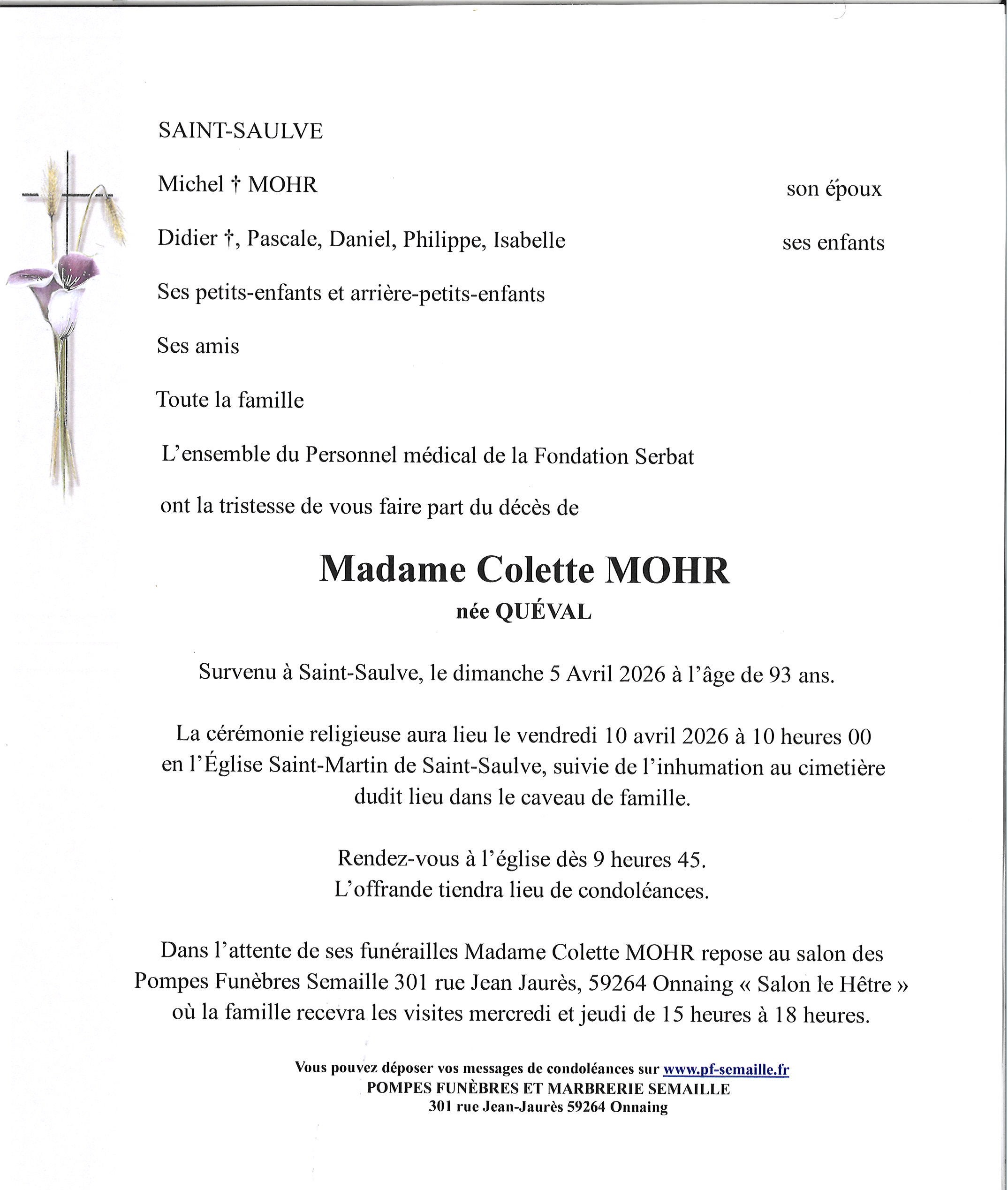 Avis de décès de Madame Colette MOHR née QUÉVAL