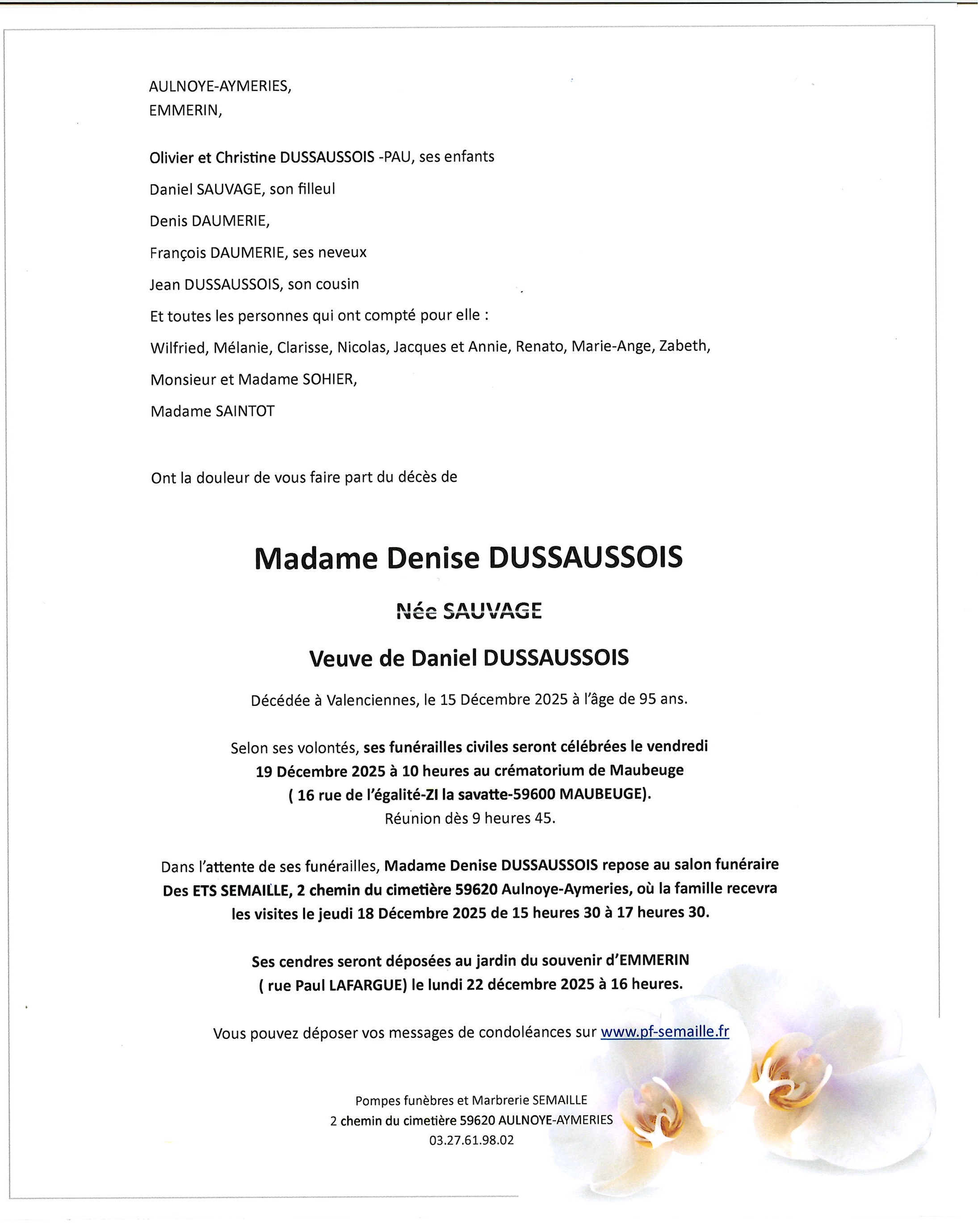 Avis de décès de Madame Denise DUSSAUSSOIS née SAUVAGE
