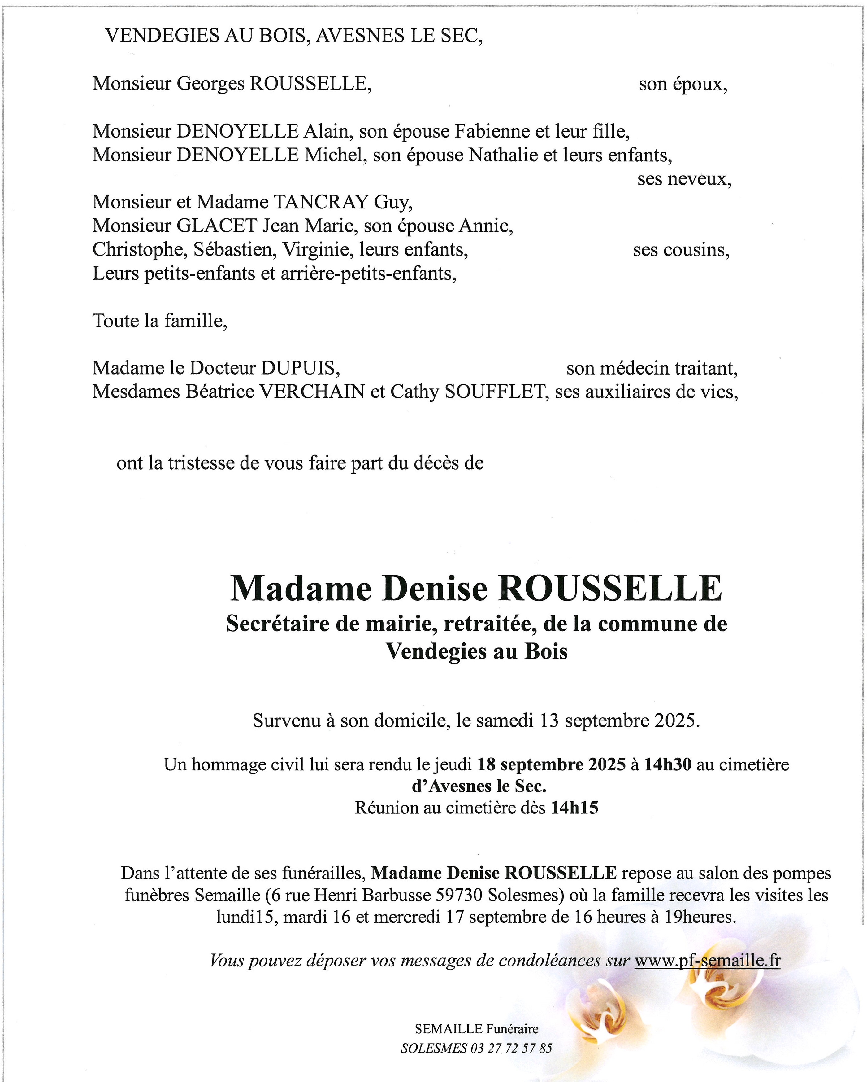 Déroulement des funérailles de Madame Denise ROUSSELLE