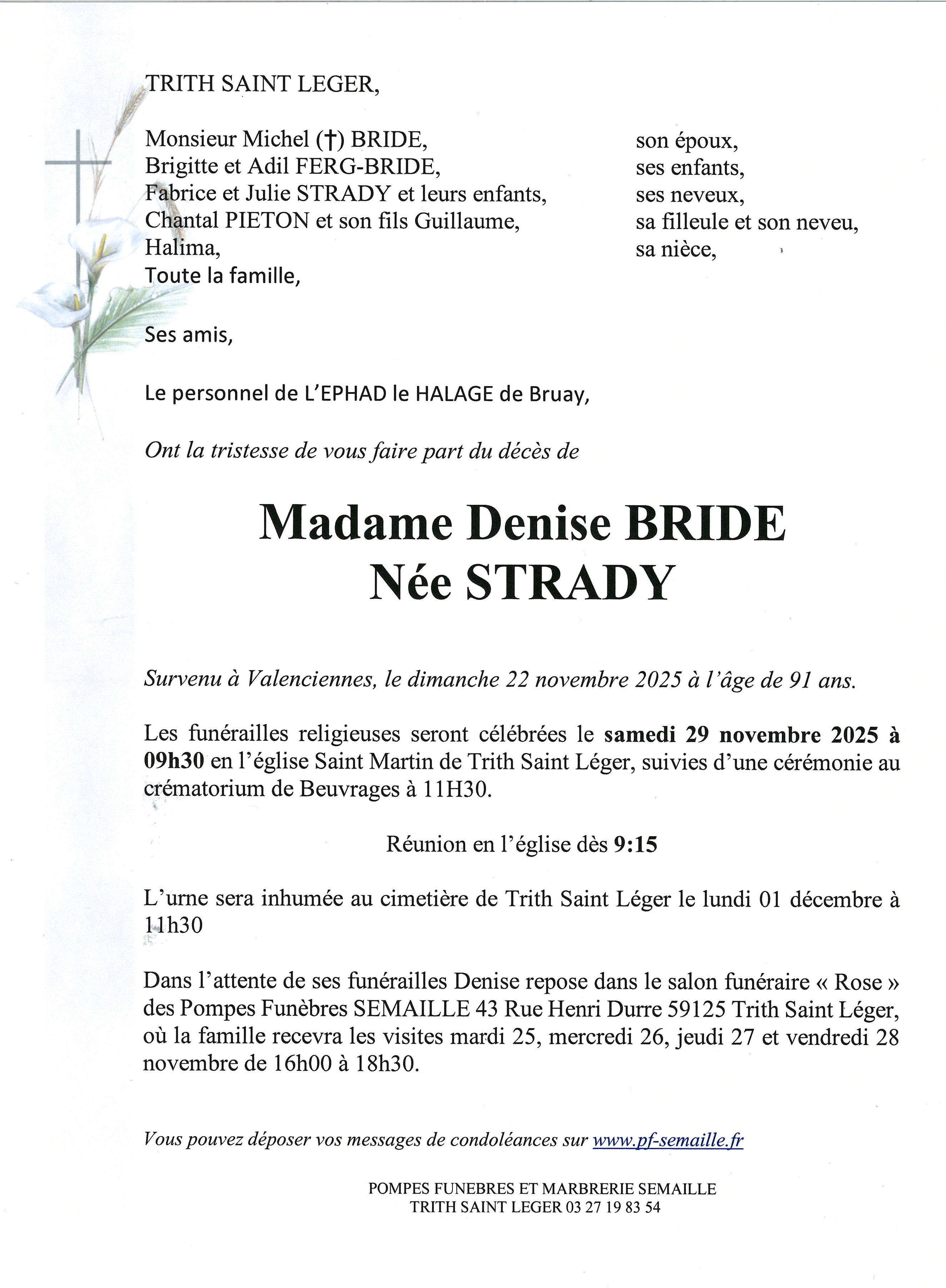 Avis de décès de Madame Denise STRADY
