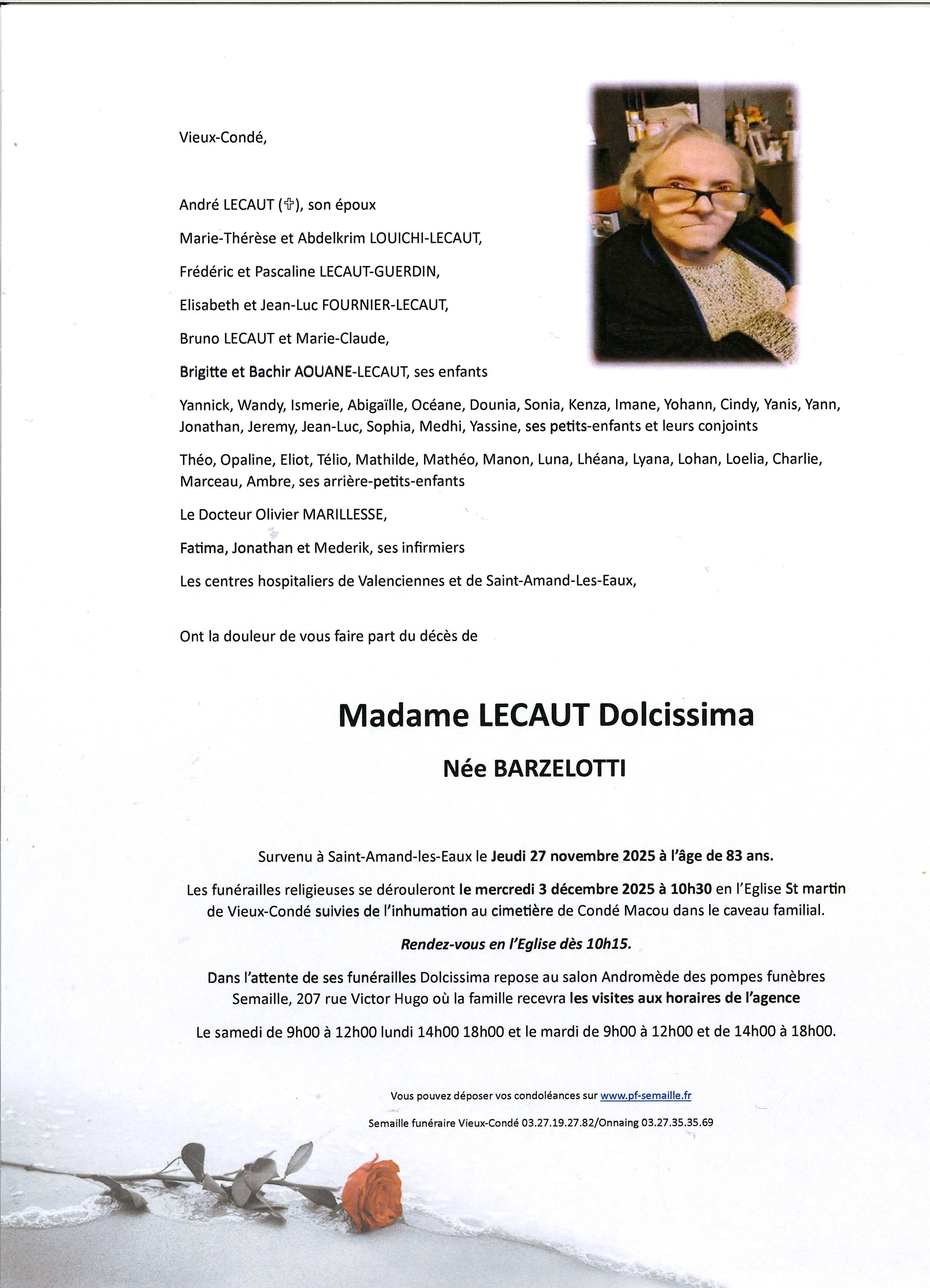 Avis de décès de Madame dolcissima LECAUT née BARZELOTTI