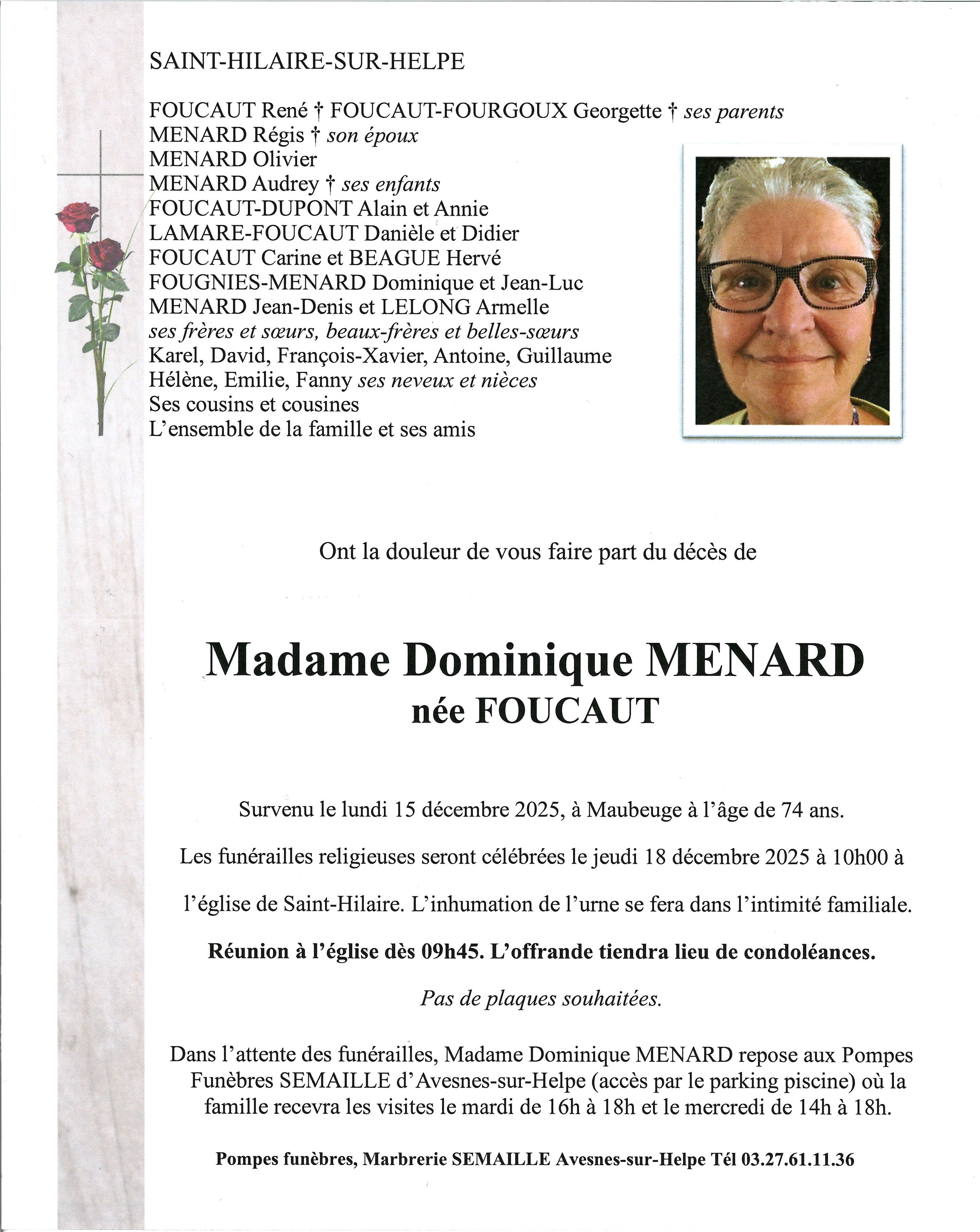 Déroulement des funérailles de Madame DOMINIQUE MENARD