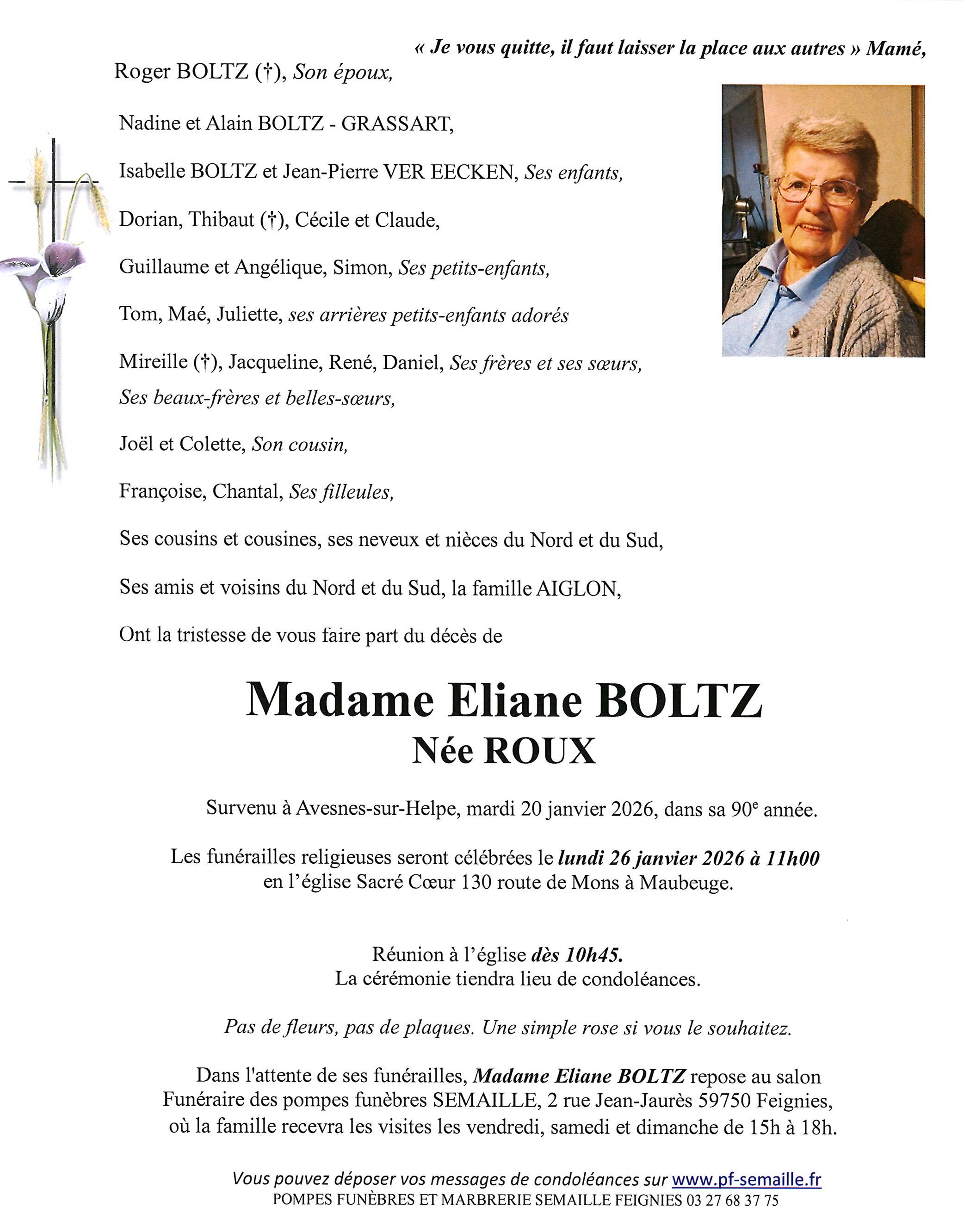 Déroulement des funérailles de Madame Eliane BOLTZ