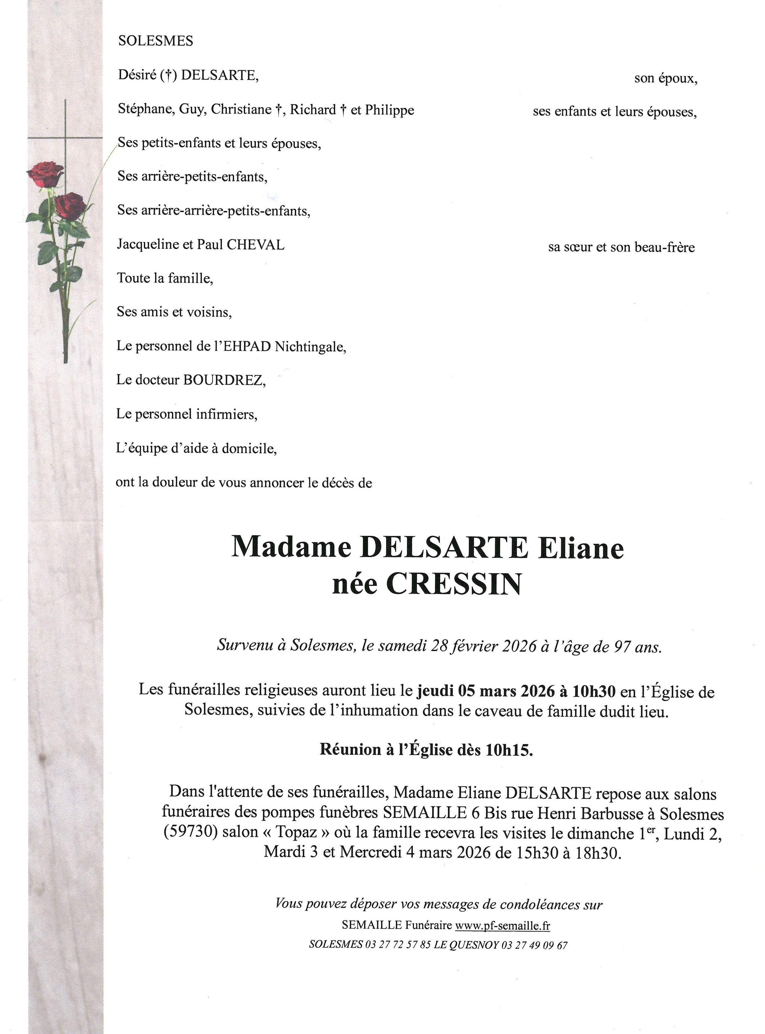 Avis de décès de Madame Eliane DELSARTE née CRESSIN