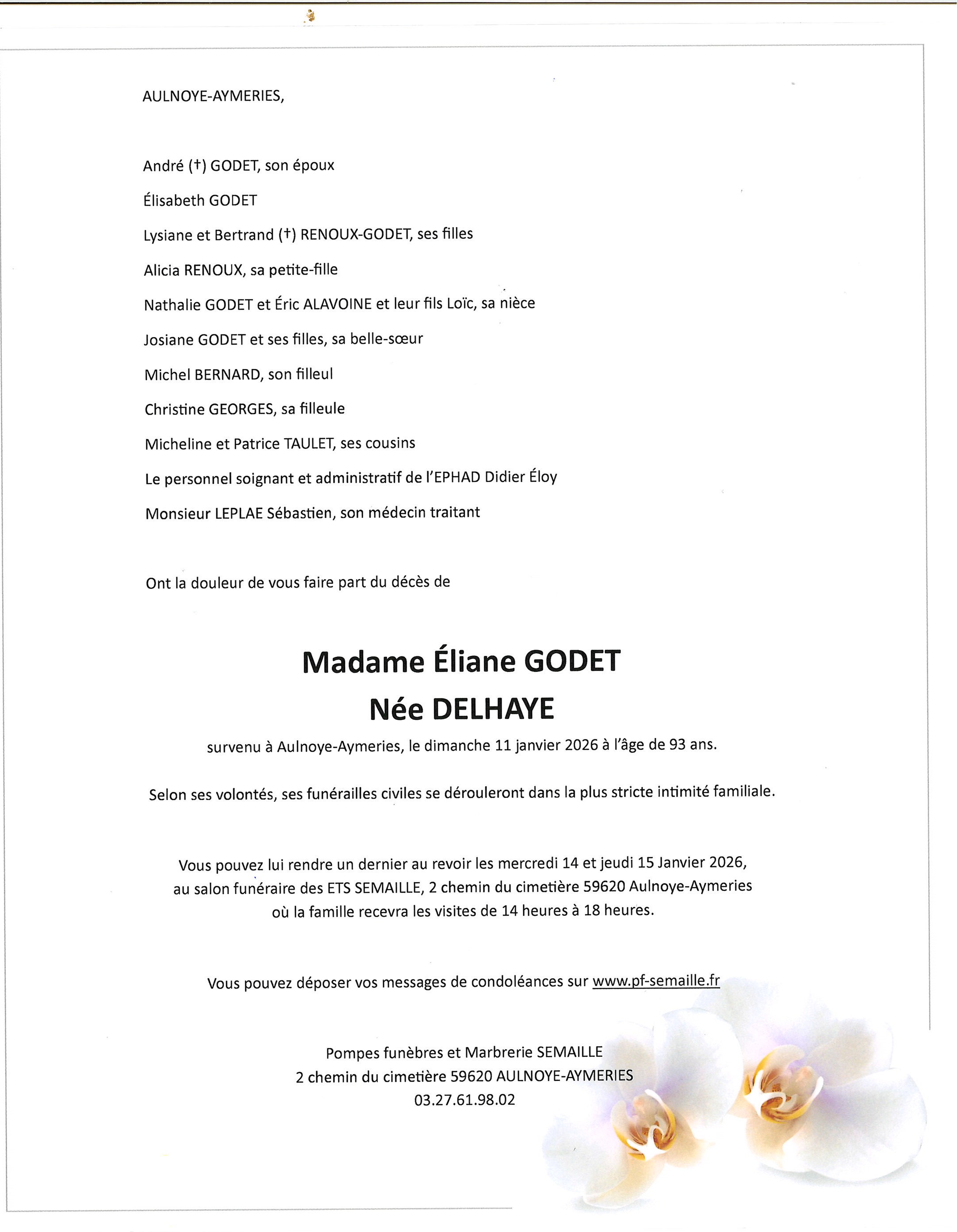 Avis de décès de Madame Éliane GODET née DELHAYE
