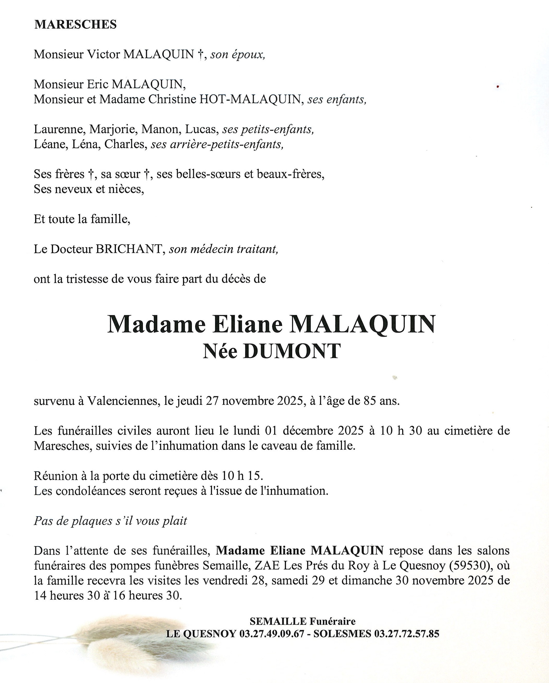 Avis de décès de Madame Eliane MALAQUIN née DUMONT