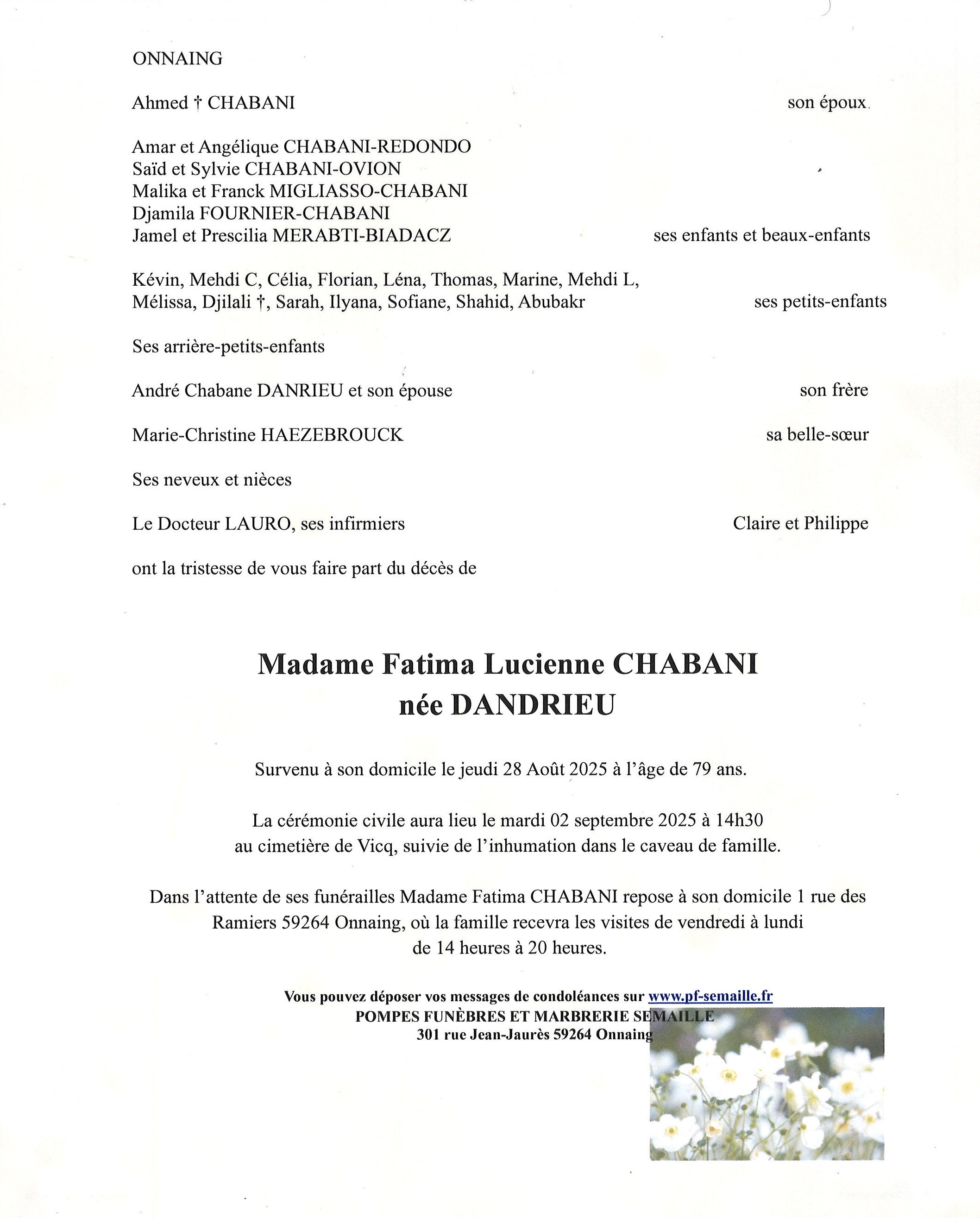 Avis de décès de Madame Fatima CHABANI née DANDRIEU