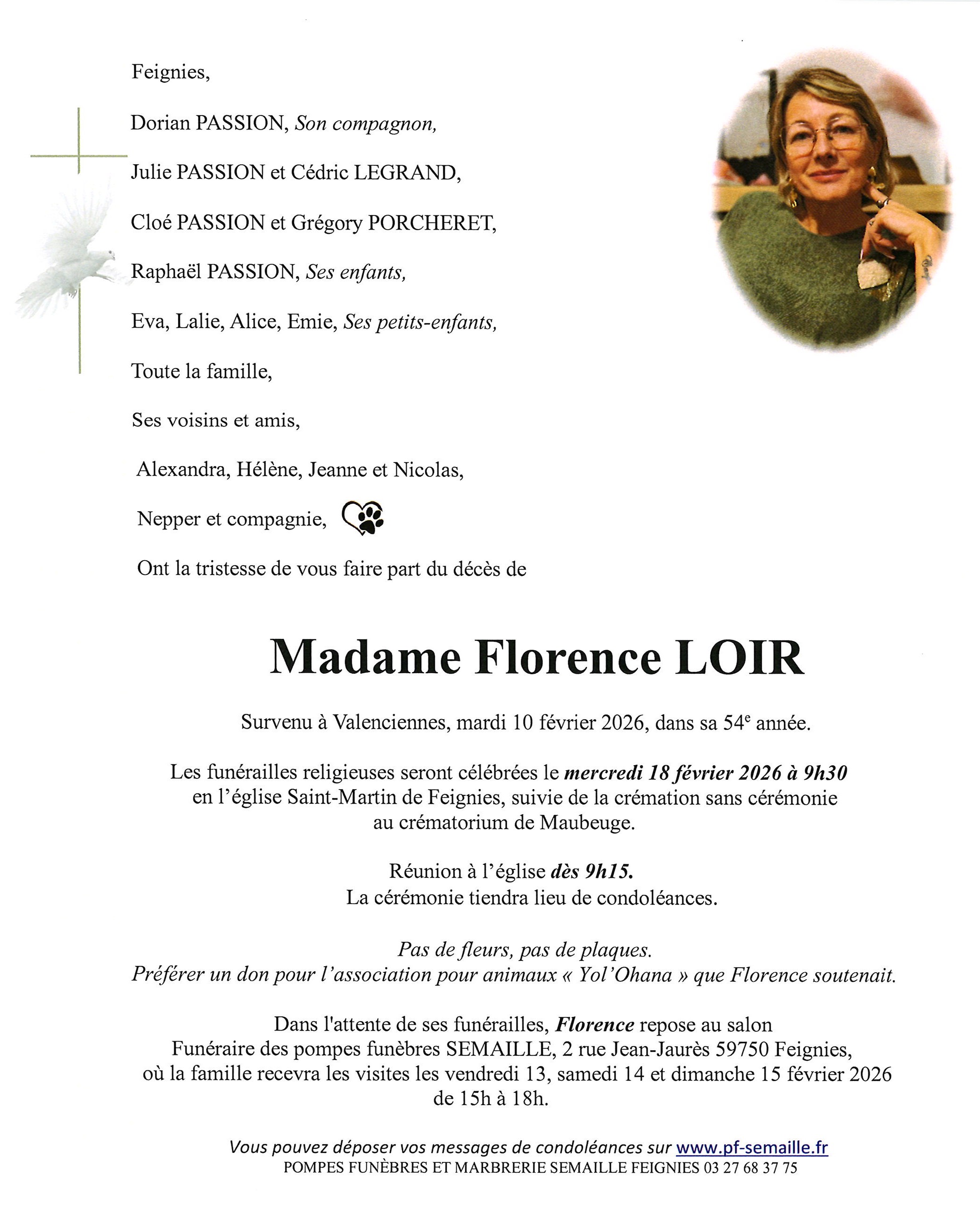 Cette page vous permet de présenter vos condoléances à la famille et de partager l'avis de décès de Florence.