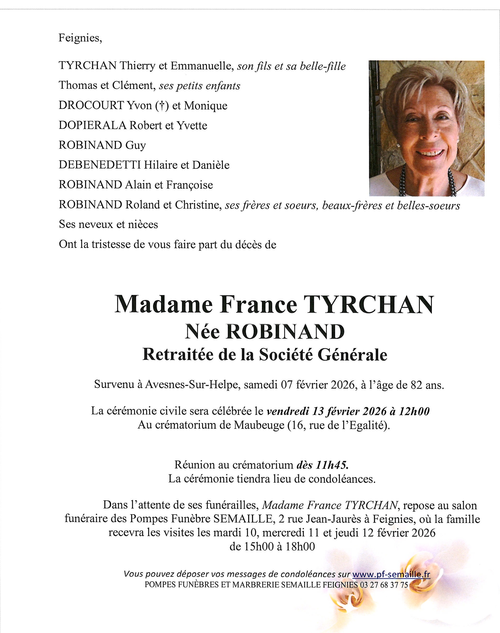 Avis de décès de Madame France TYRCHAN née ROBINAND