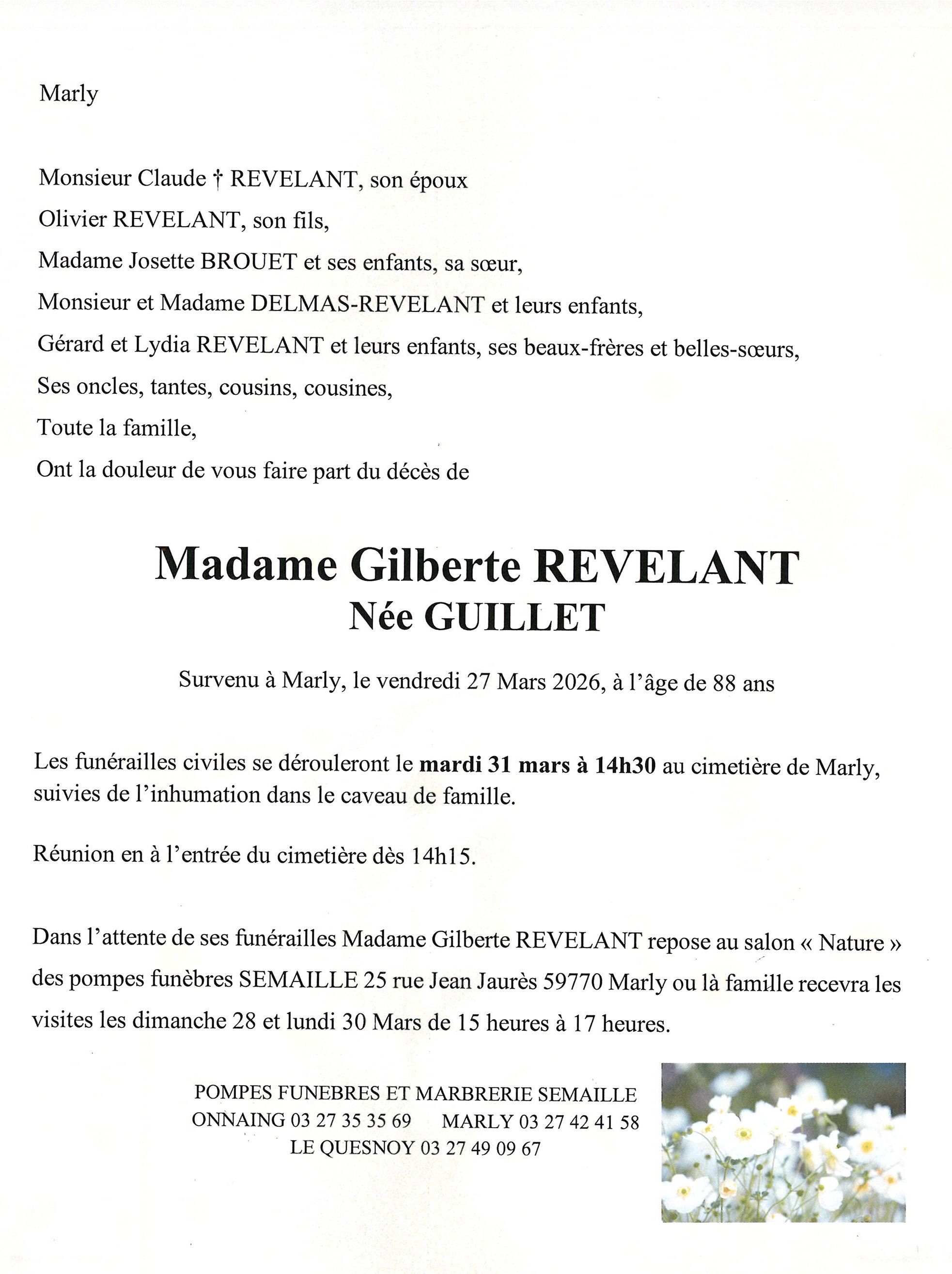 Avis de décès de Madame Gilberte REVELANT née GUILLET