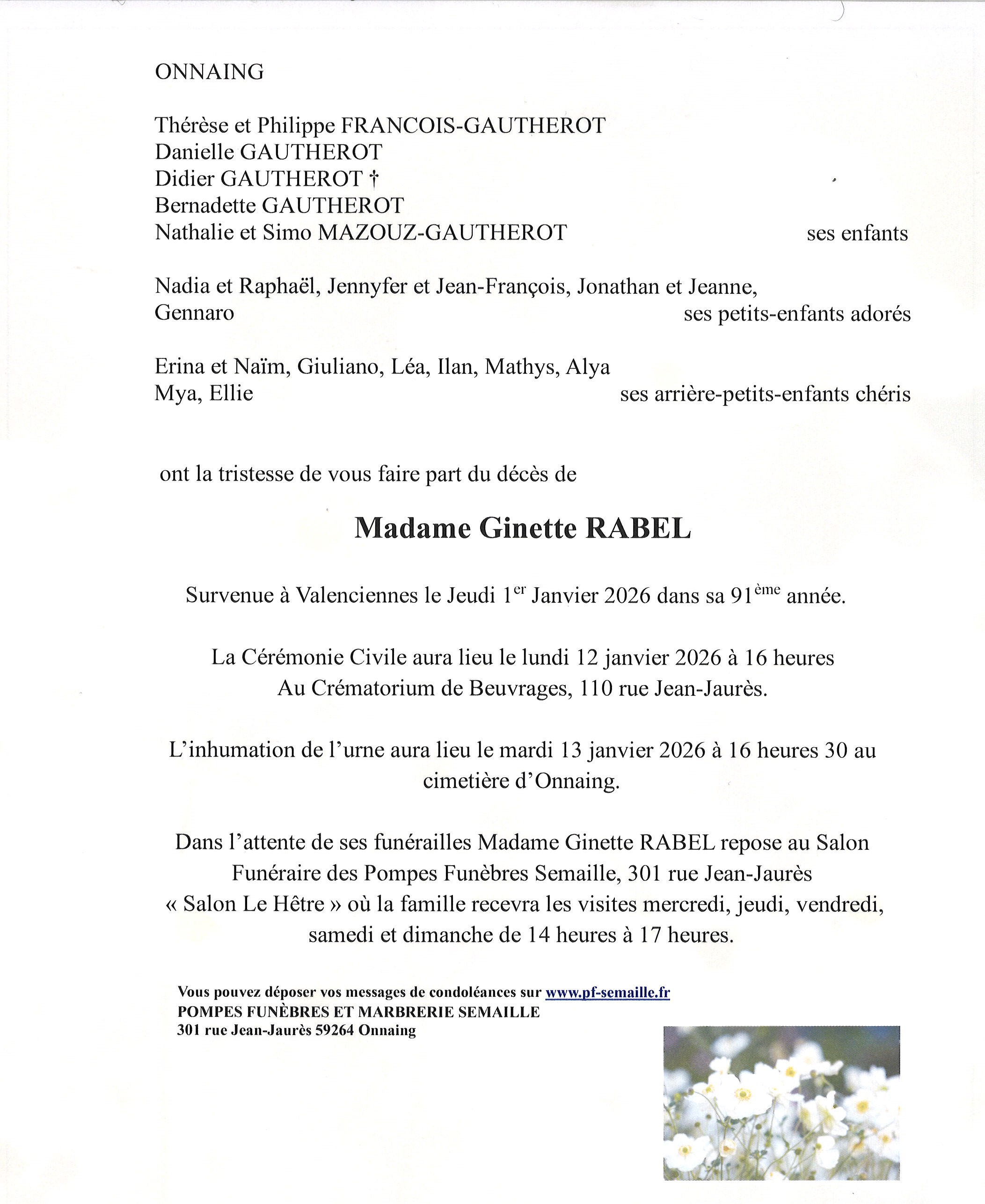 Cette page vous permet de présenter vos condoléances à la famille et de partager l'avis de décès de Ginette.