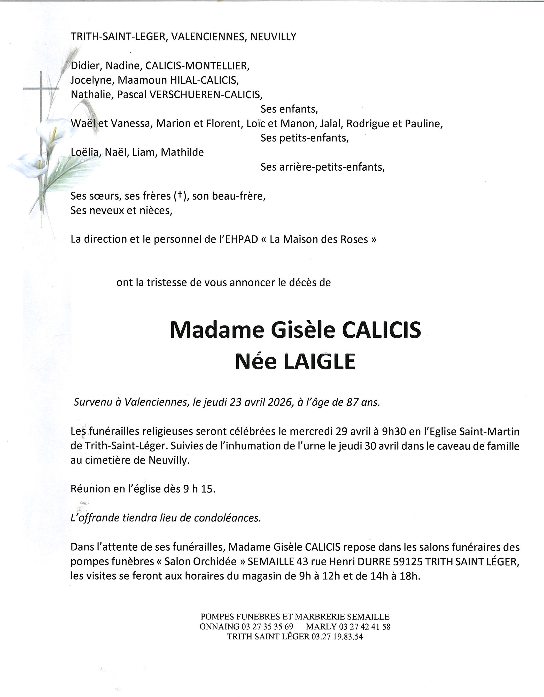 Avis de décès de Madame Gisèle CALICIS née LAIGLE