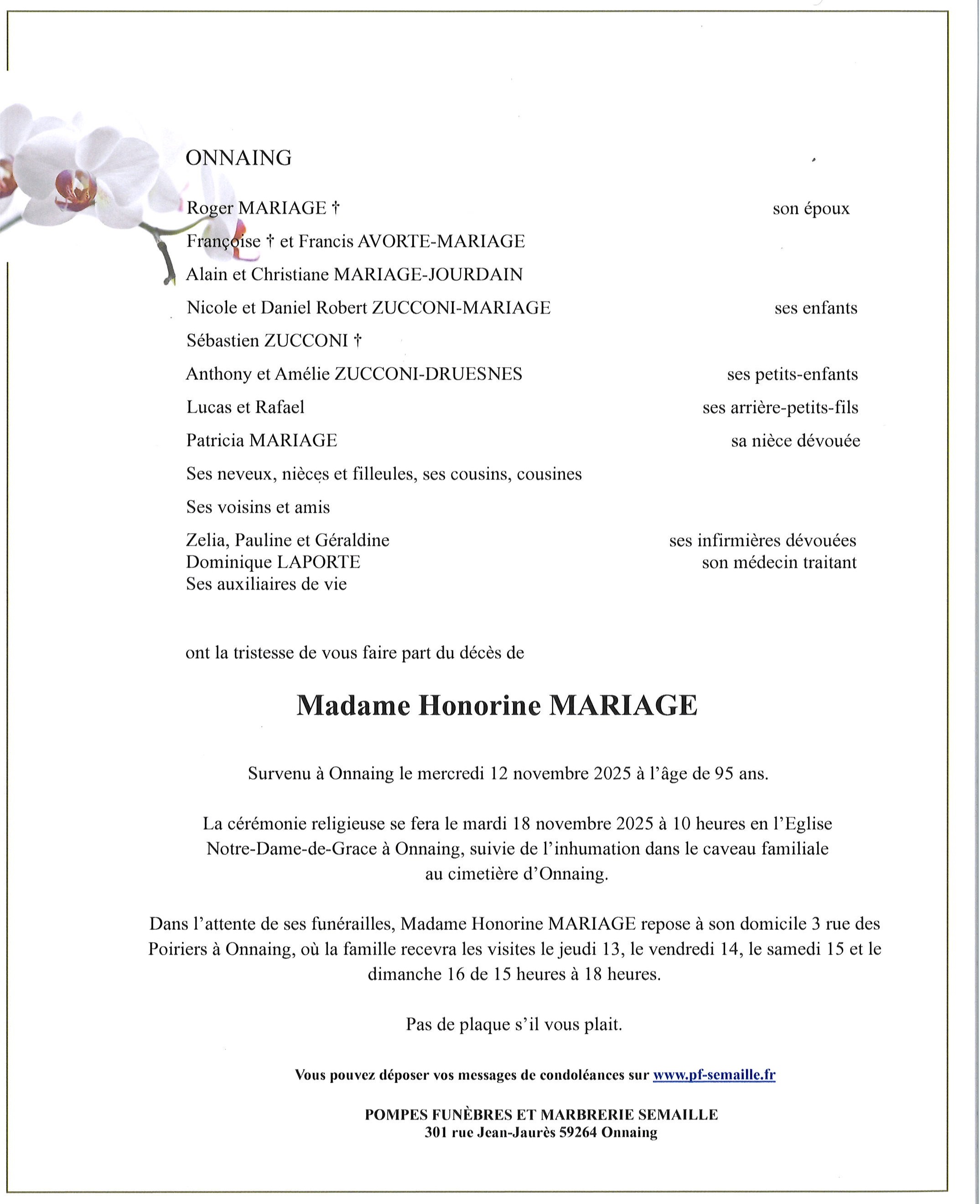 Déroulement des funérailles de Madame Honorée MARIAGE