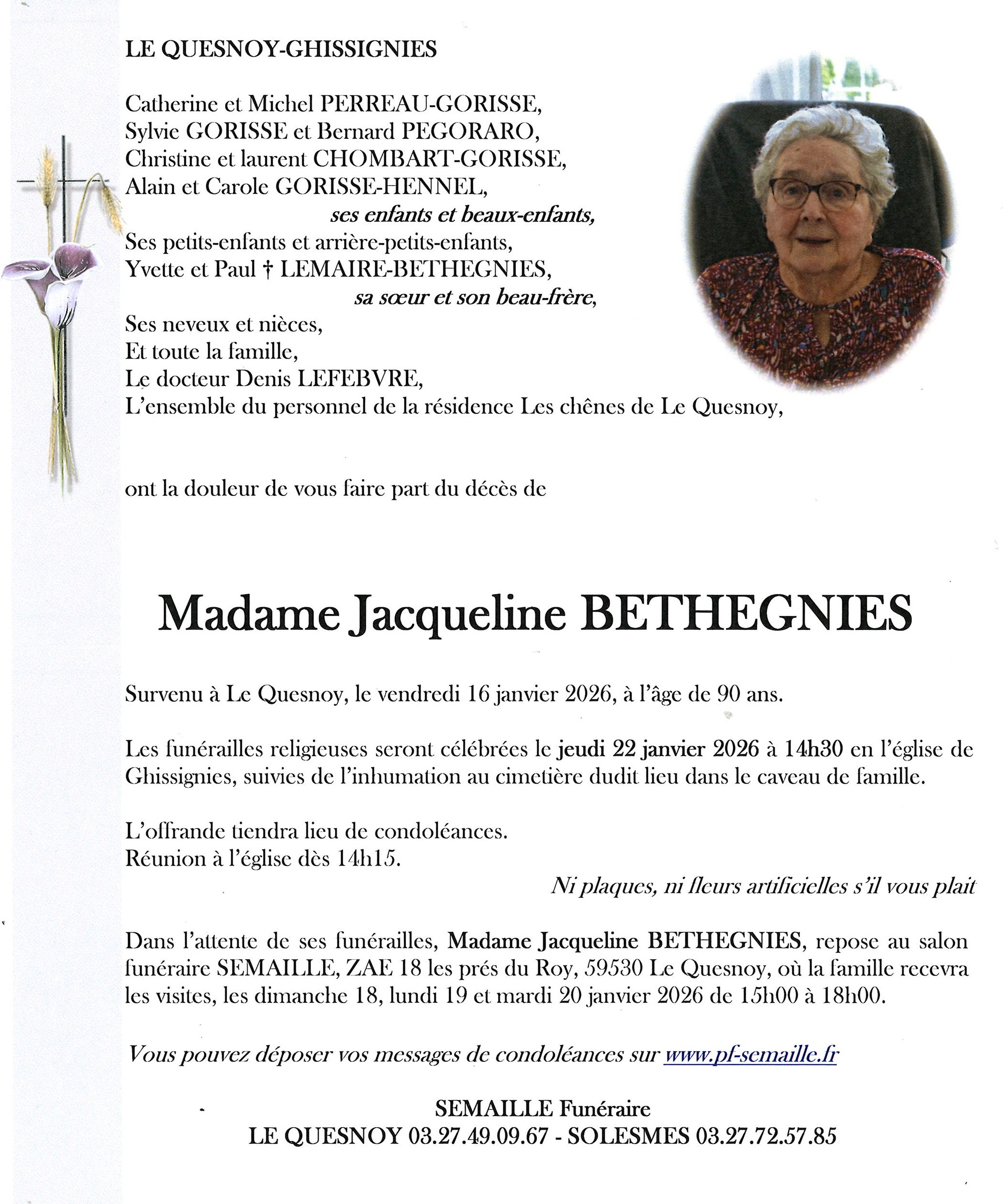 Avis de décès de Madame Jacqueline BÉTHEGNIES
