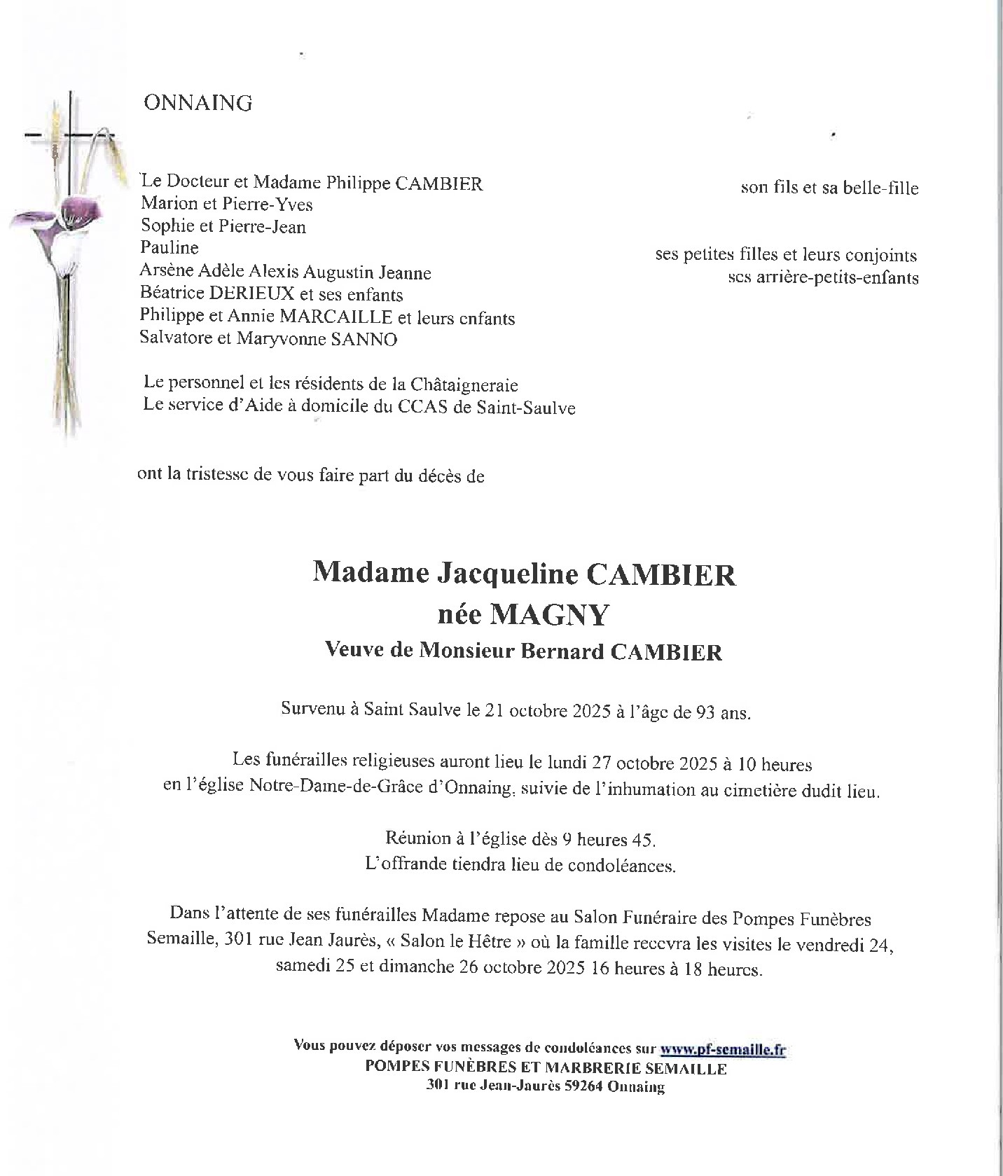 Avis de décès de Madame Jacqueline CAMBIER née MAGNY