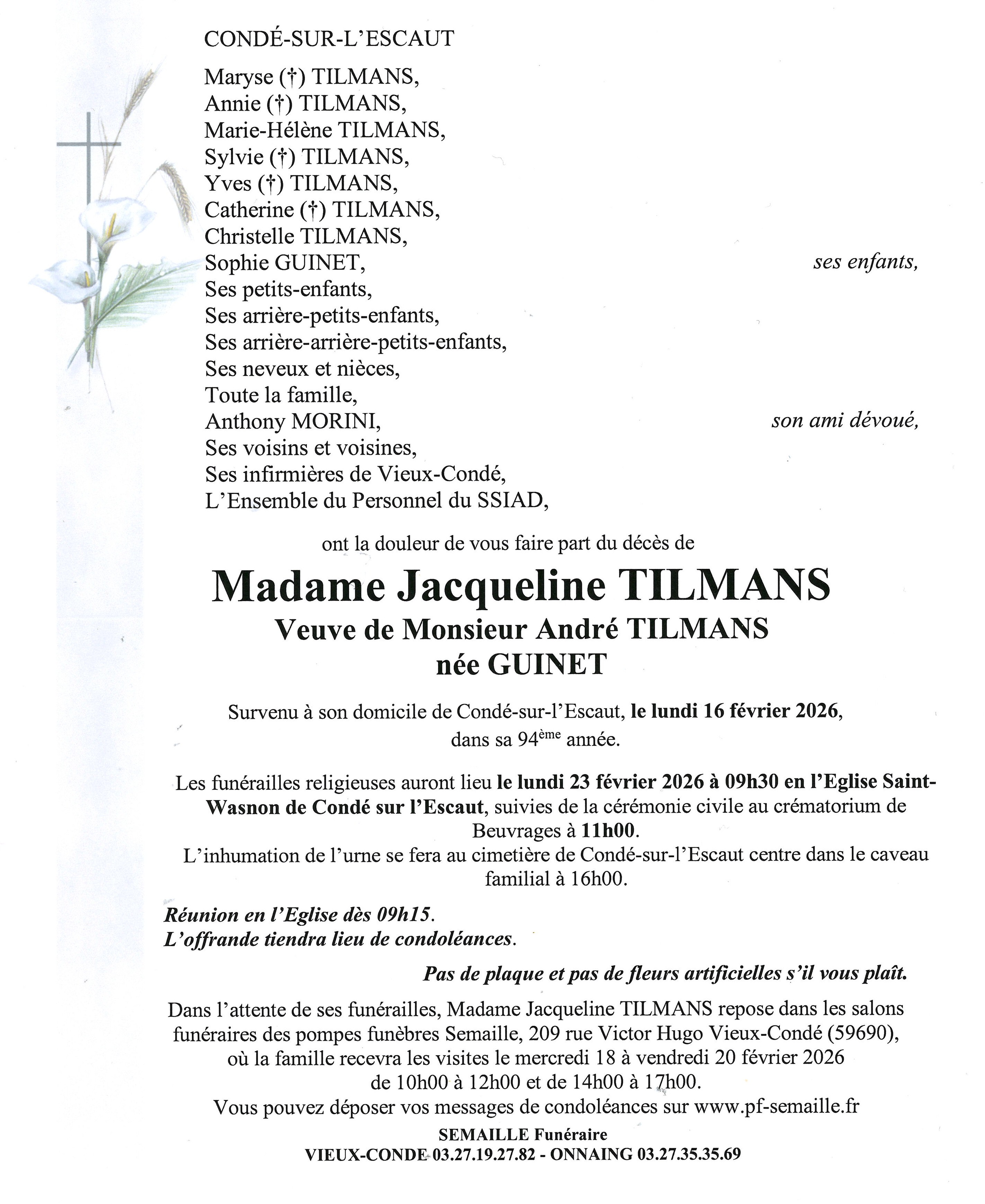 Déroulement des funérailles de Madame Jacqueline TILMANS