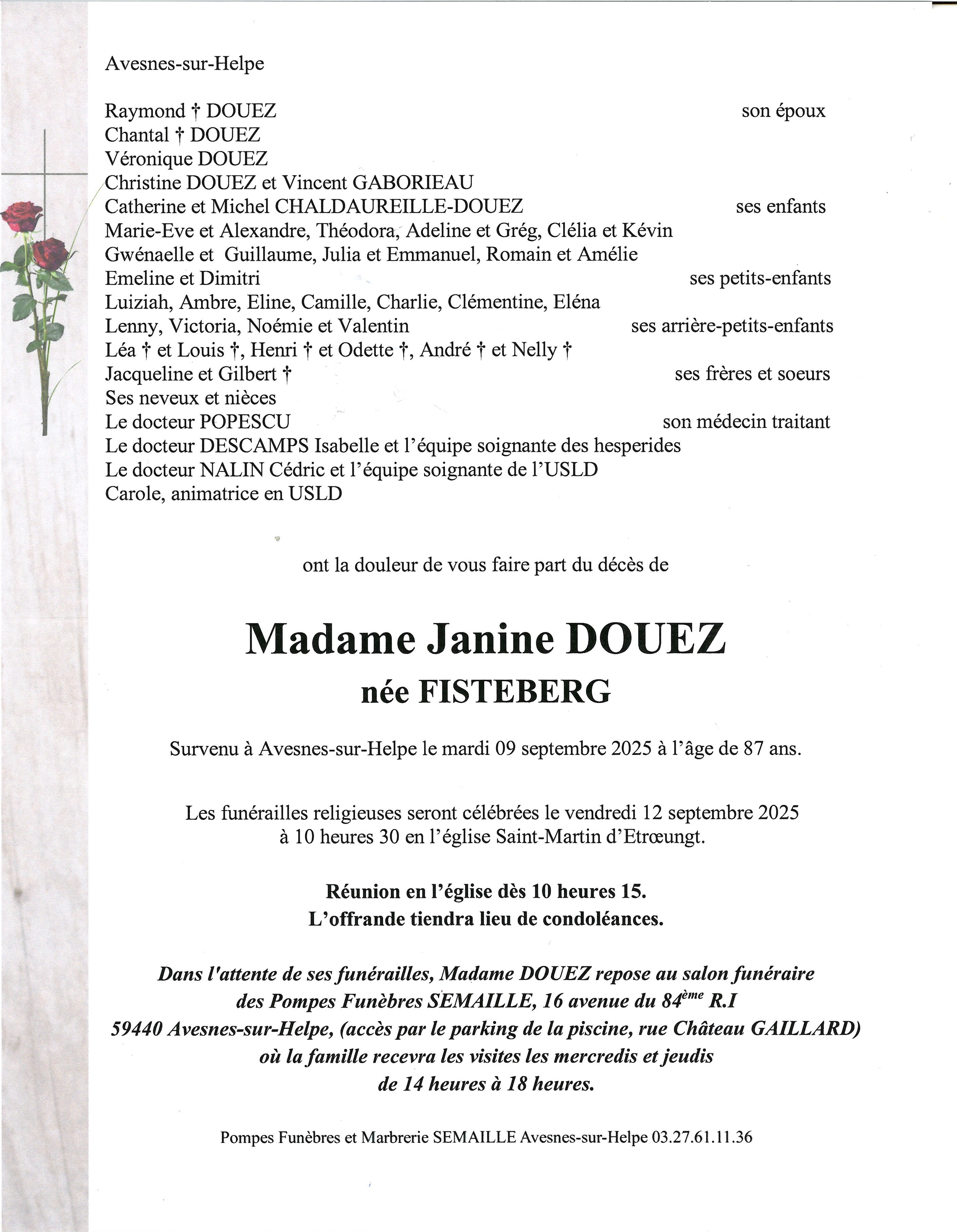 Avis de décès de Madame JANINE DOUEZ née FISTEBERG