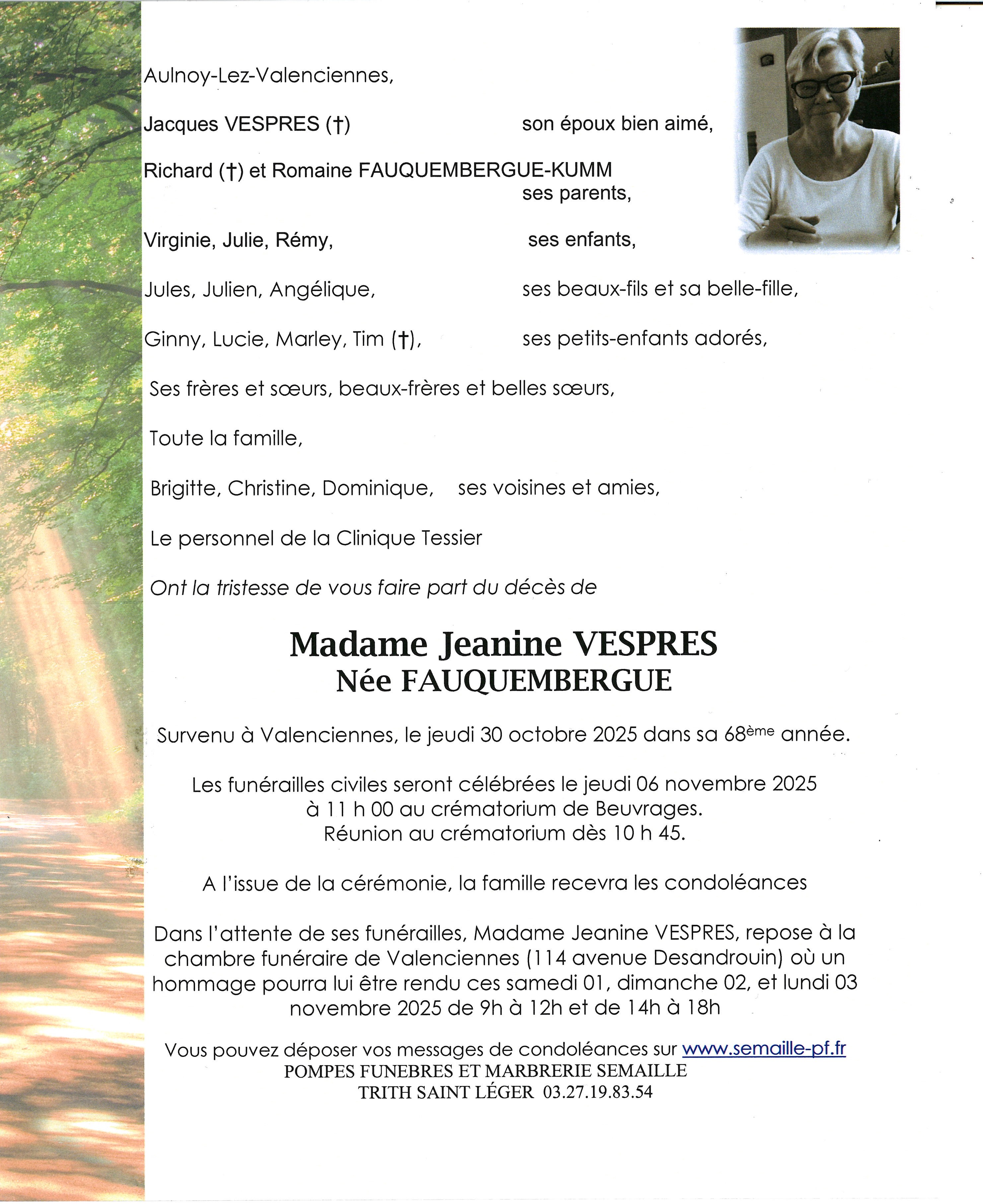 Avis de décès de Madame Jeanine VESPRES née FAUQUEMBERGUE