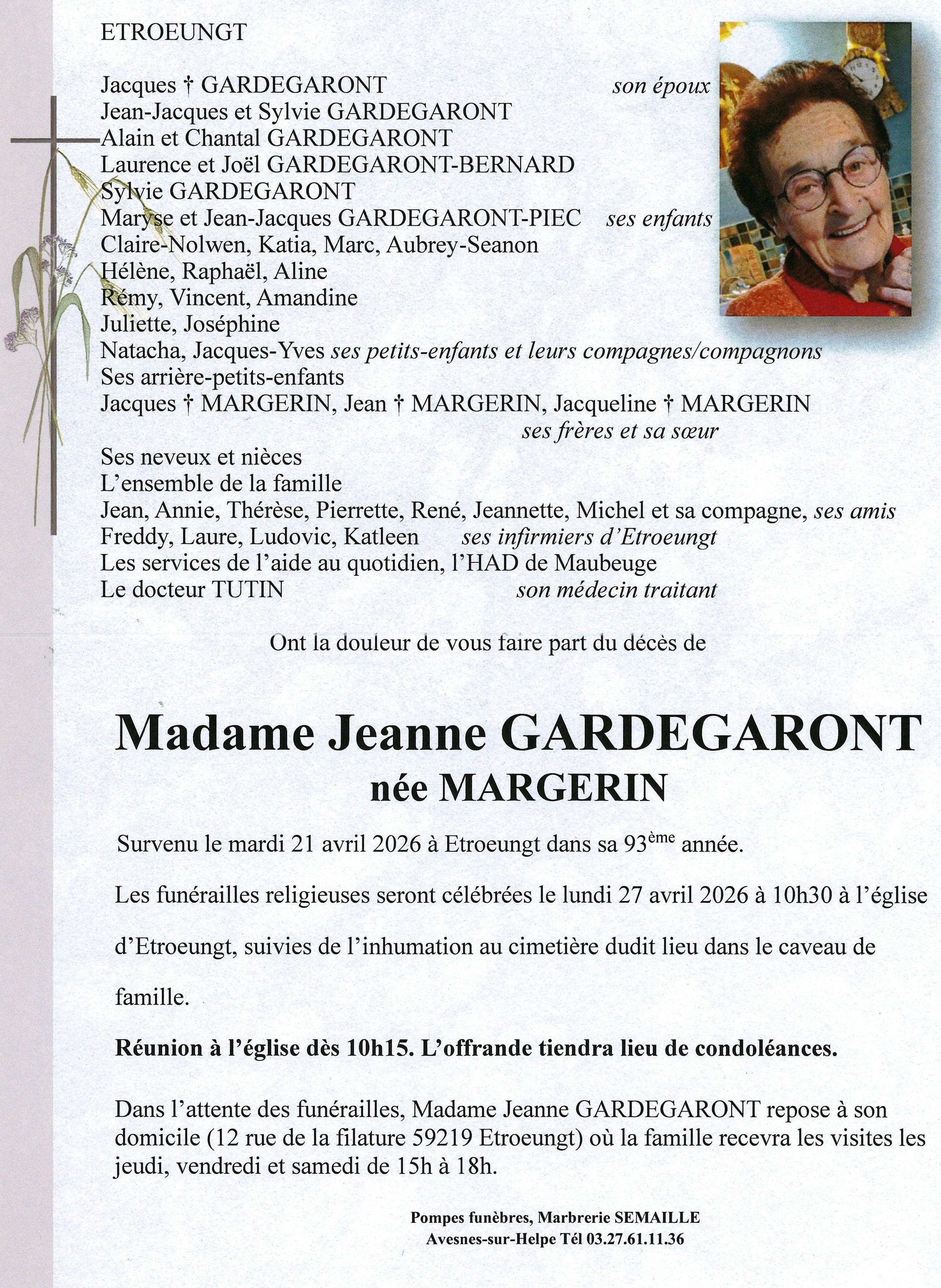 Avis de décès de Madame Jeanne GARDEGARONT