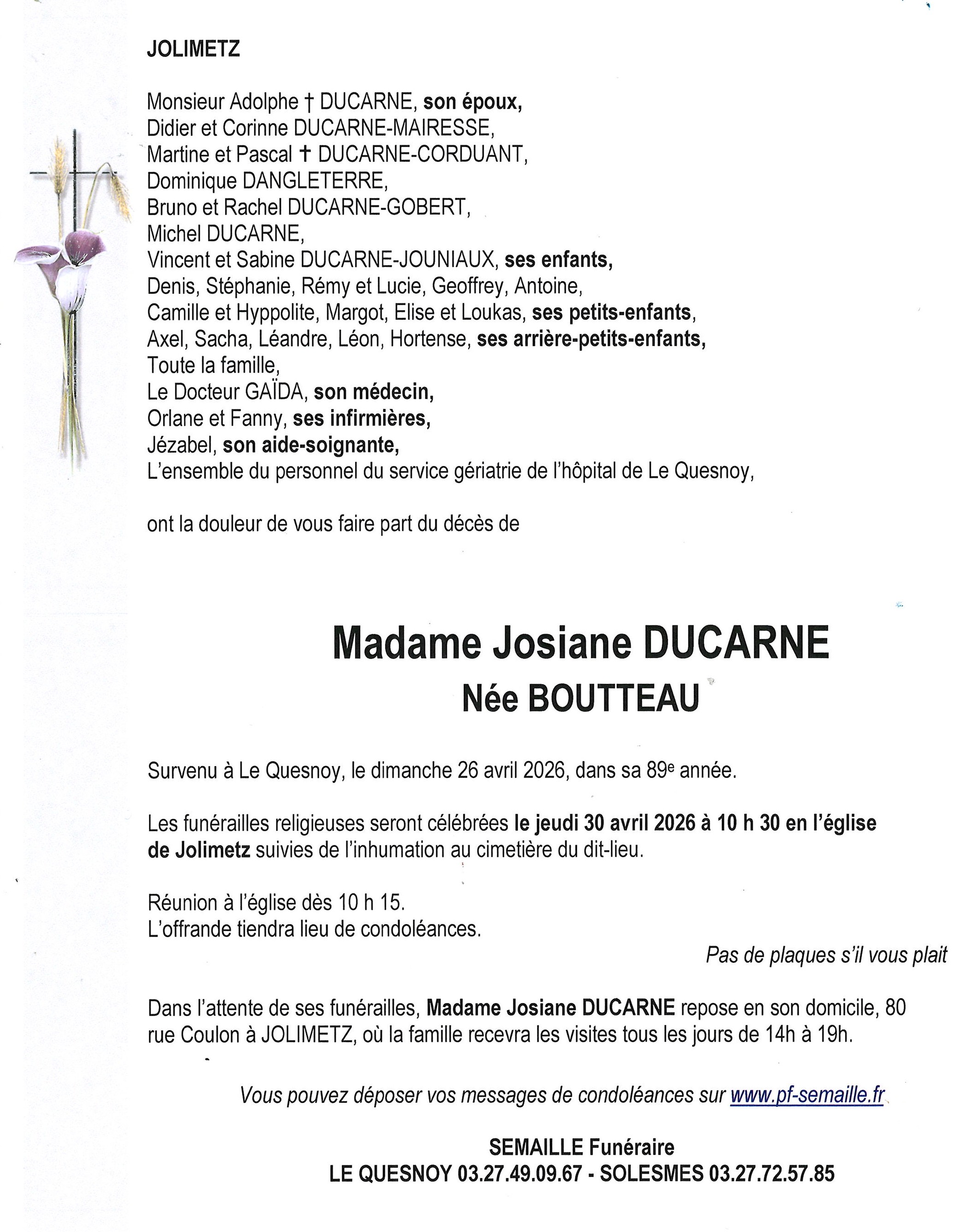 Avis de décès de Madame Josiane DUCARNE née BOUTTEAU