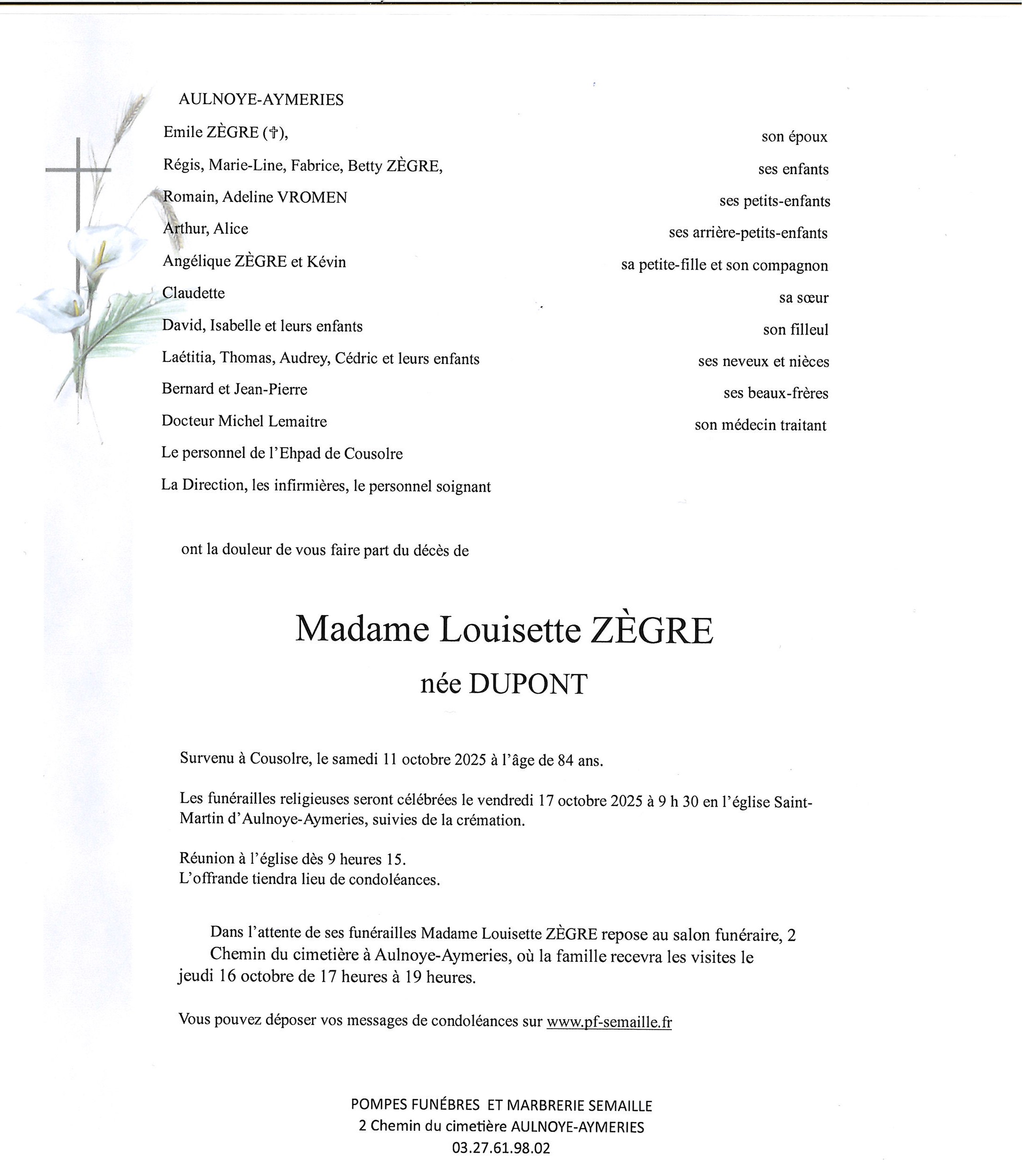 Déroulement des funérailles de Madame Louisette ZÉGRE