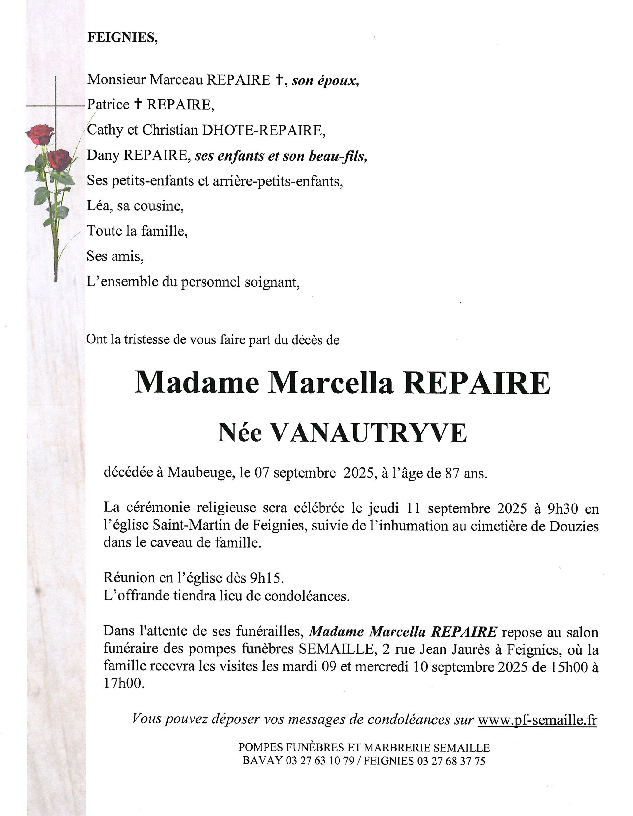 Avis de décès de Madame Marcella REPAIRE née VANAUTRYVE