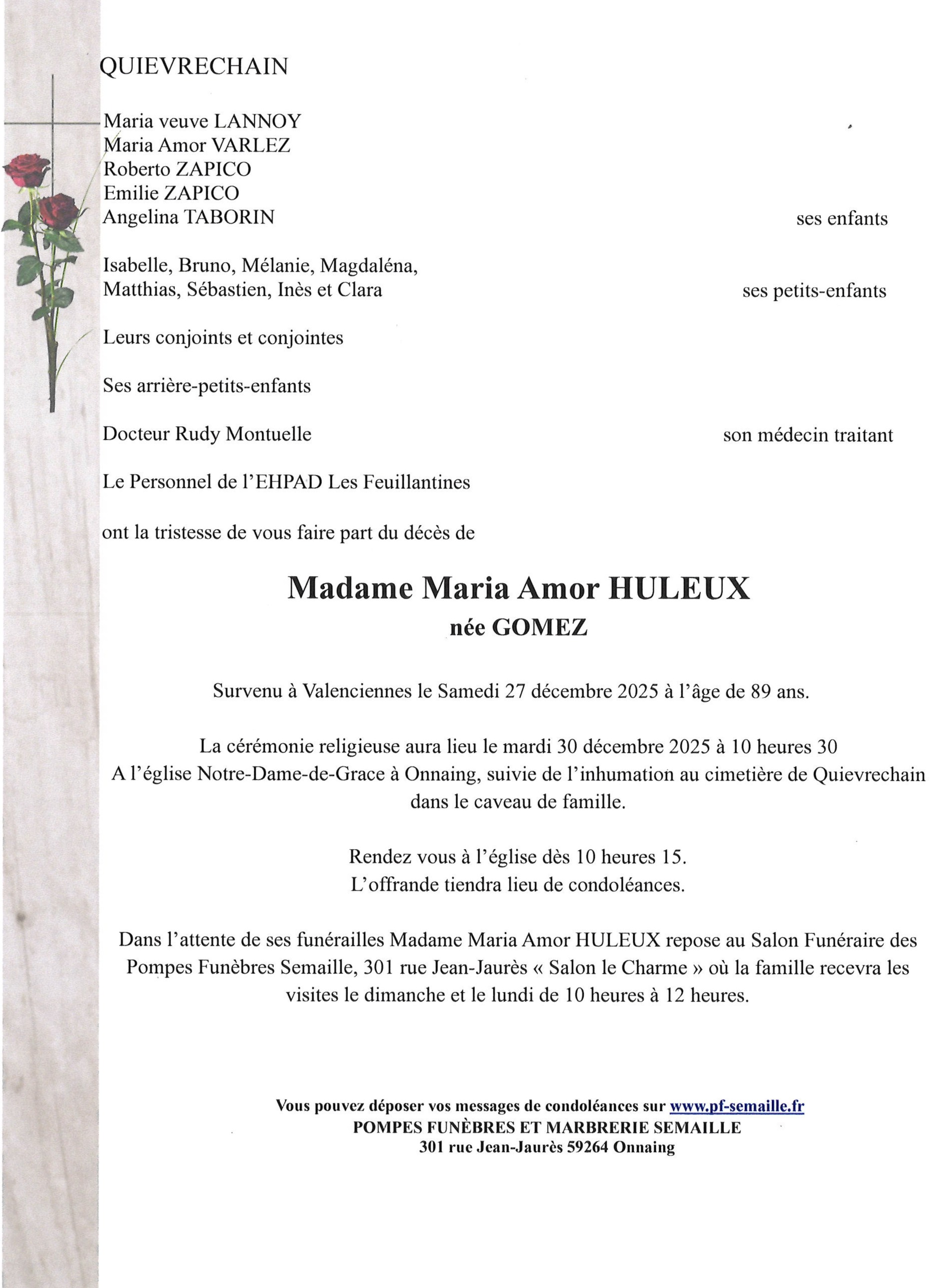 Avis de décès de Madame Maria-Amor HULEUX née GOMEZ