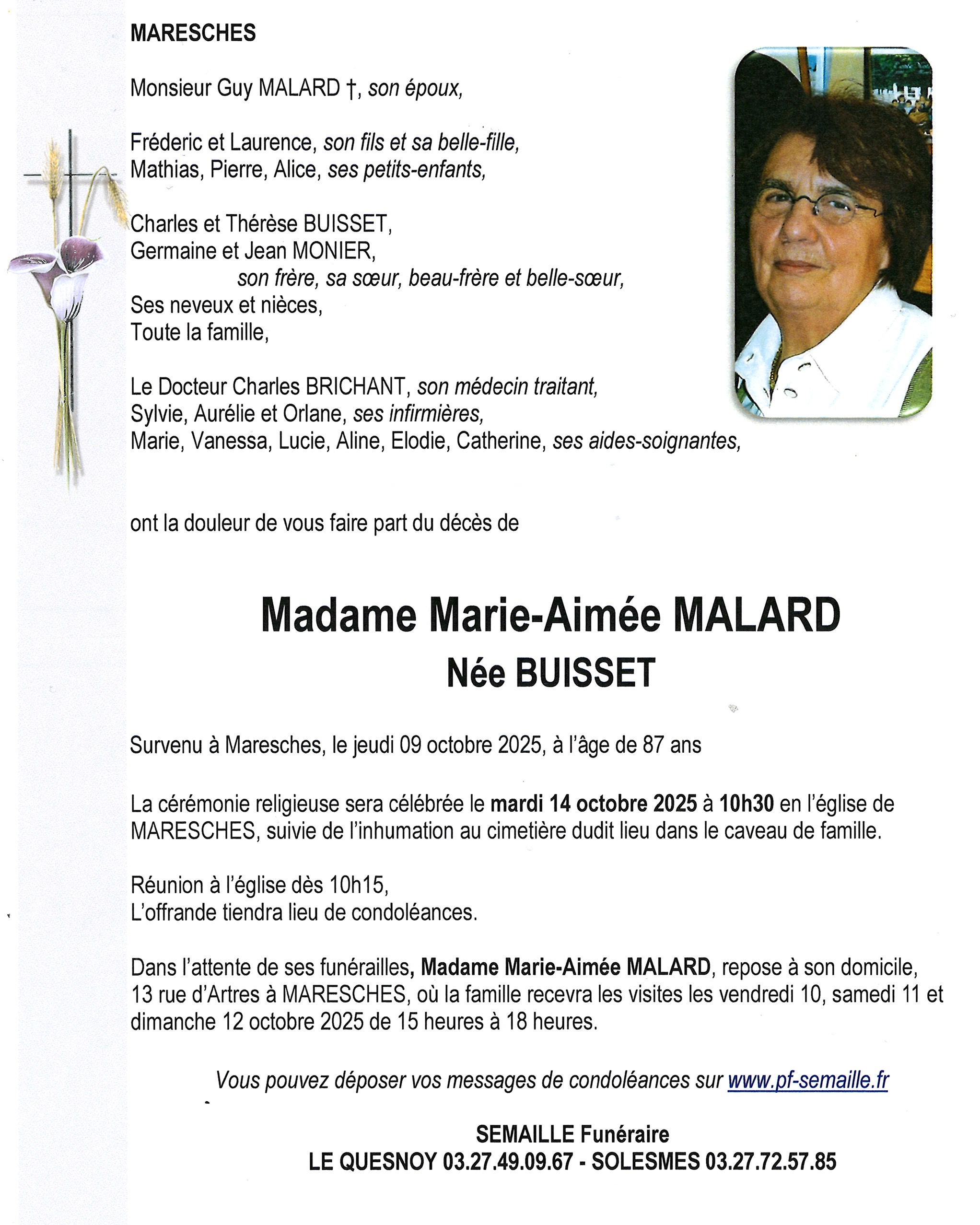 Cette page vous permet de présenter vos condoléances à la famille et de partager l'avis de décès de Marie-Aimée.