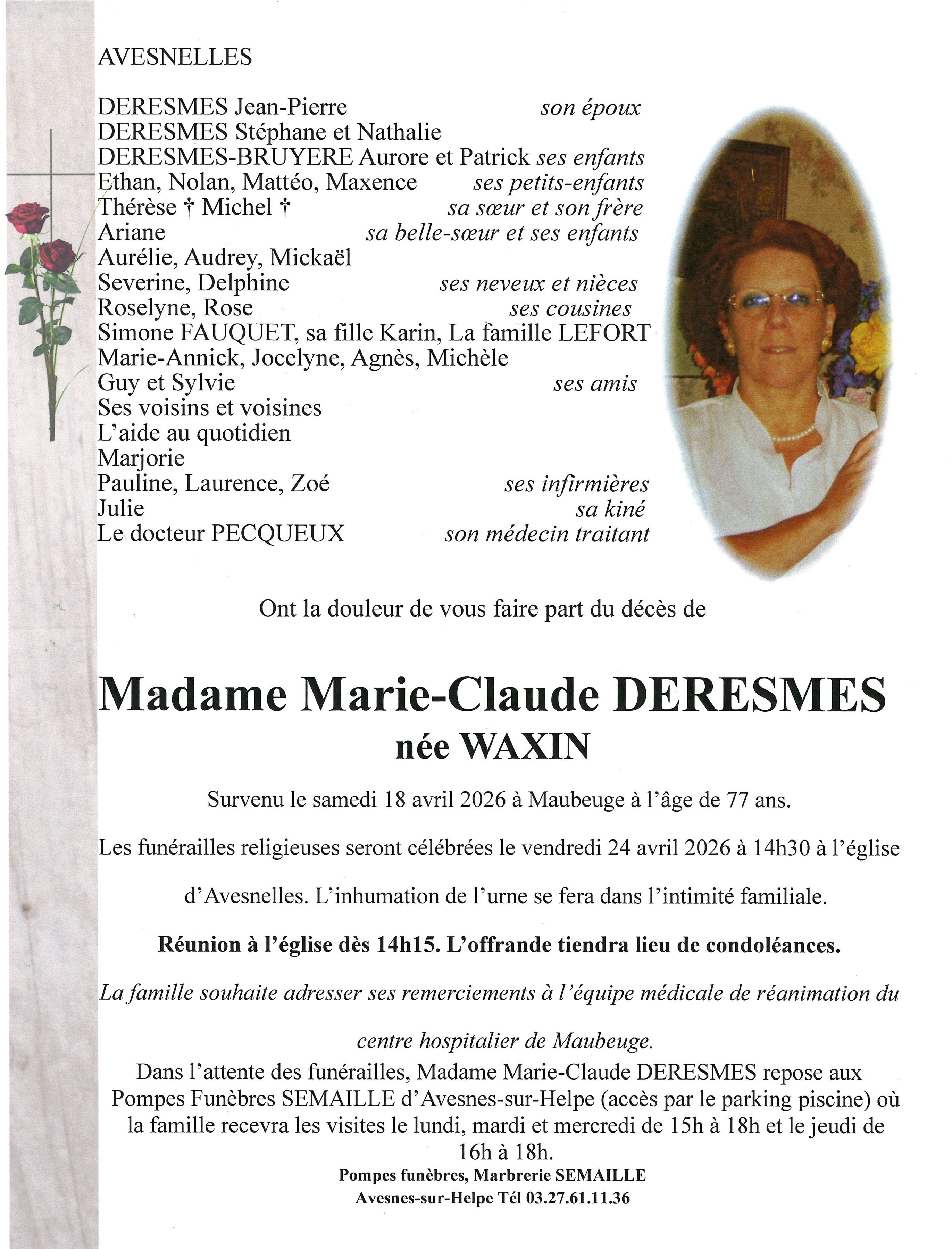 Avis de décès de Madame MARIE-CLAUDE DERESMES