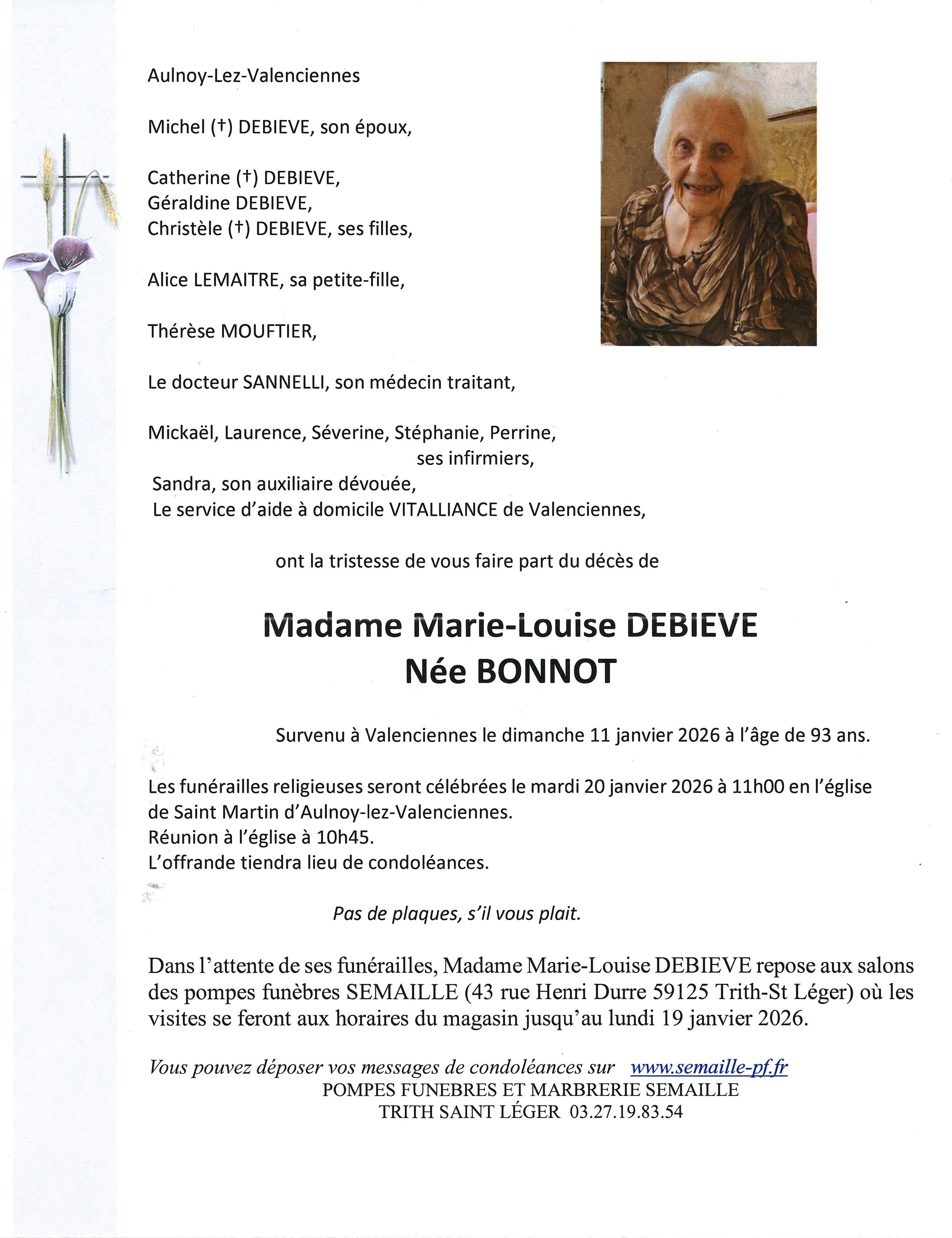 Avis de décès de Madame MARIE-LOUISE DEBIEVE née BONNOT