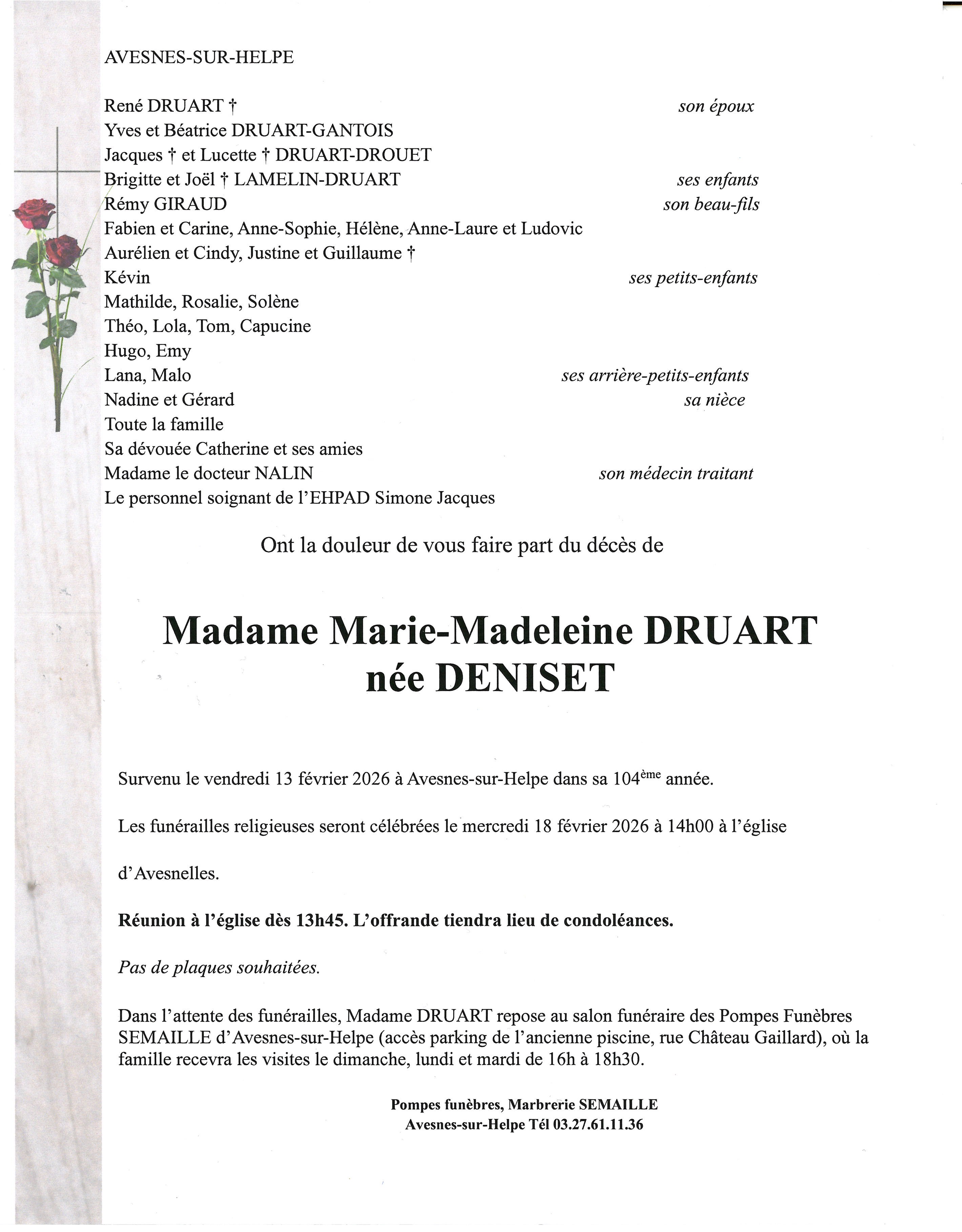 Déroulement des funérailles de Madame MARIE-MADELEINE DRUART