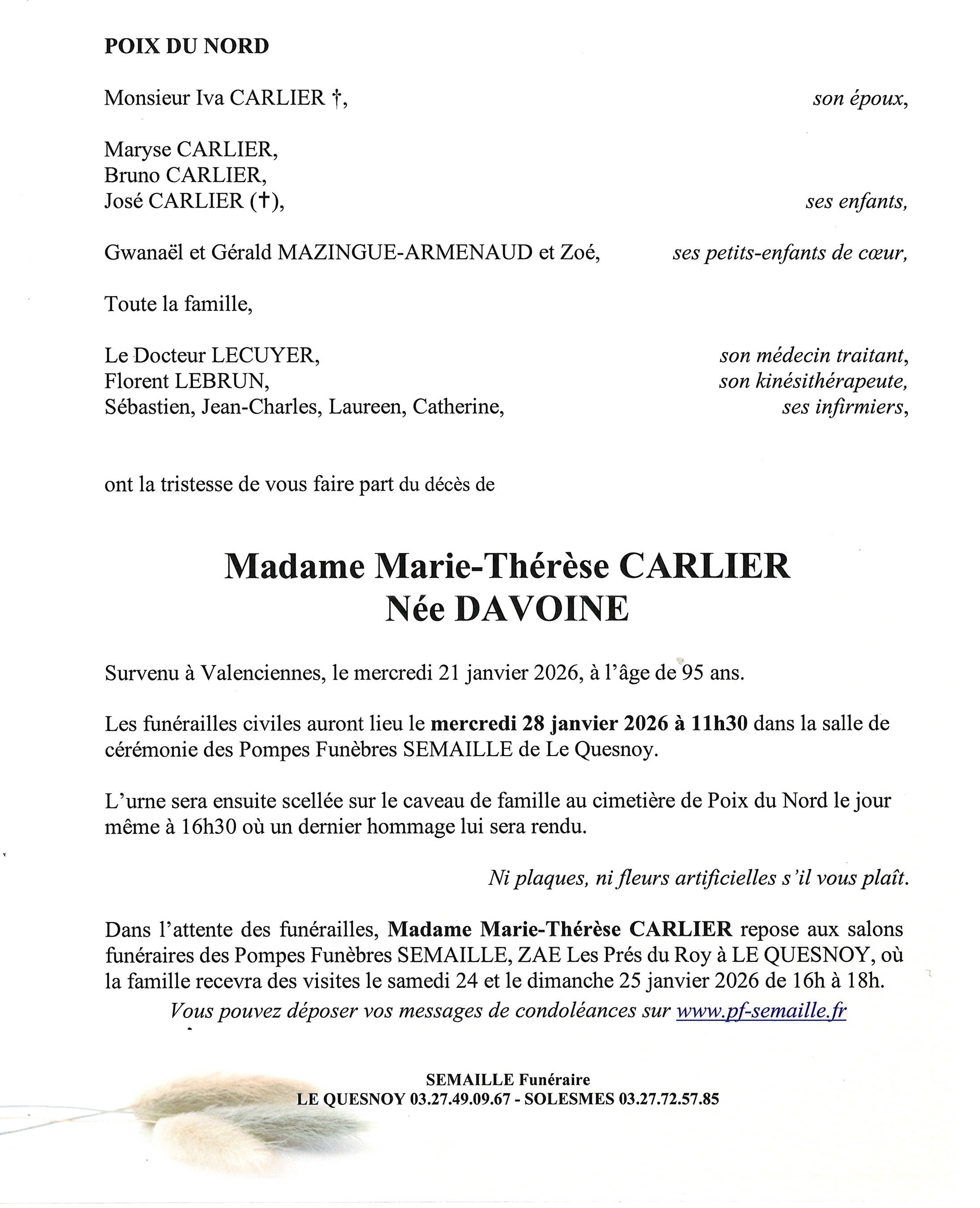 Avis de décès de Madame Marie-Thérese CARLIER née DAVOINE