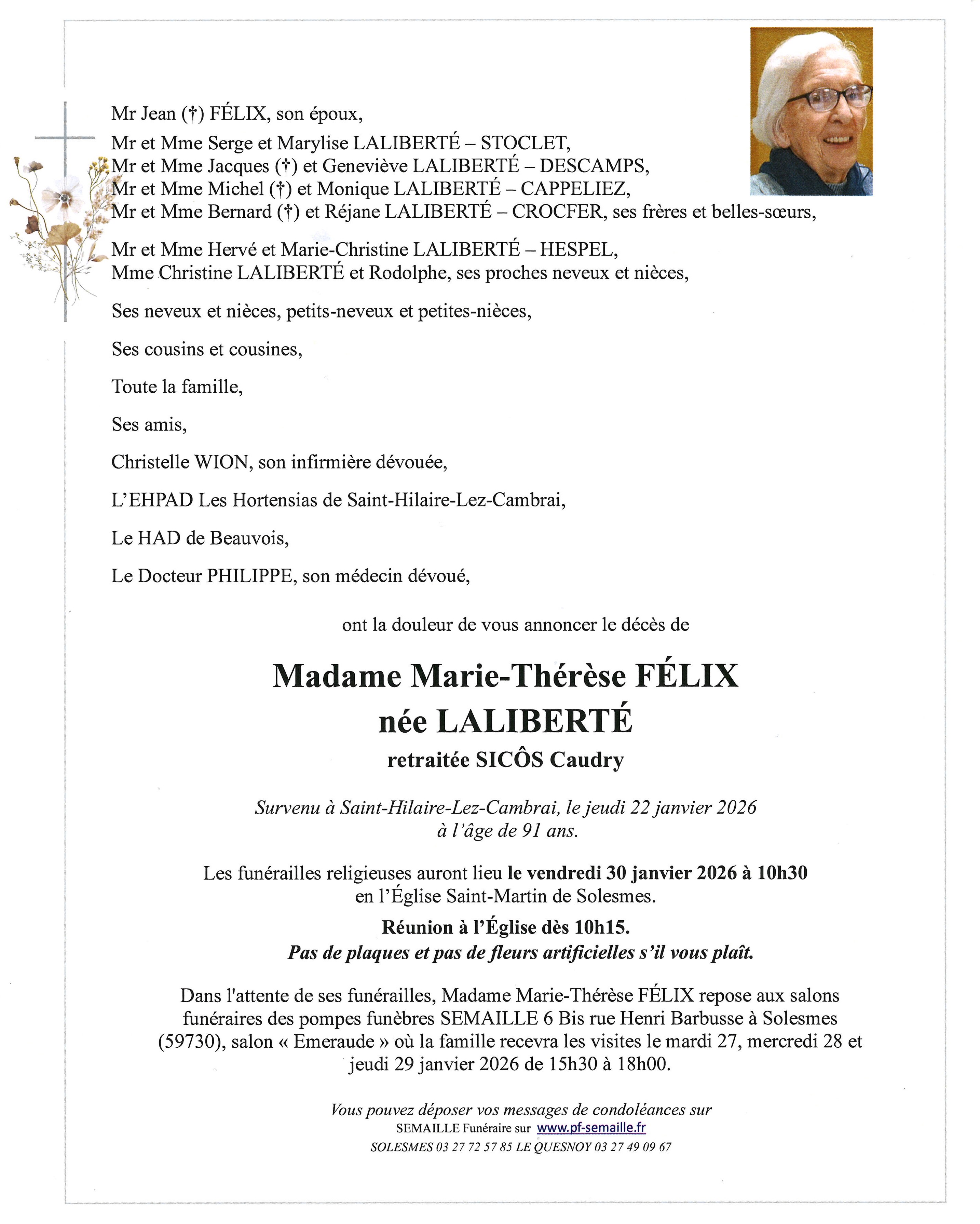 Avis de décès de Madame Marie Thérèse FELIX née LALIBERTE