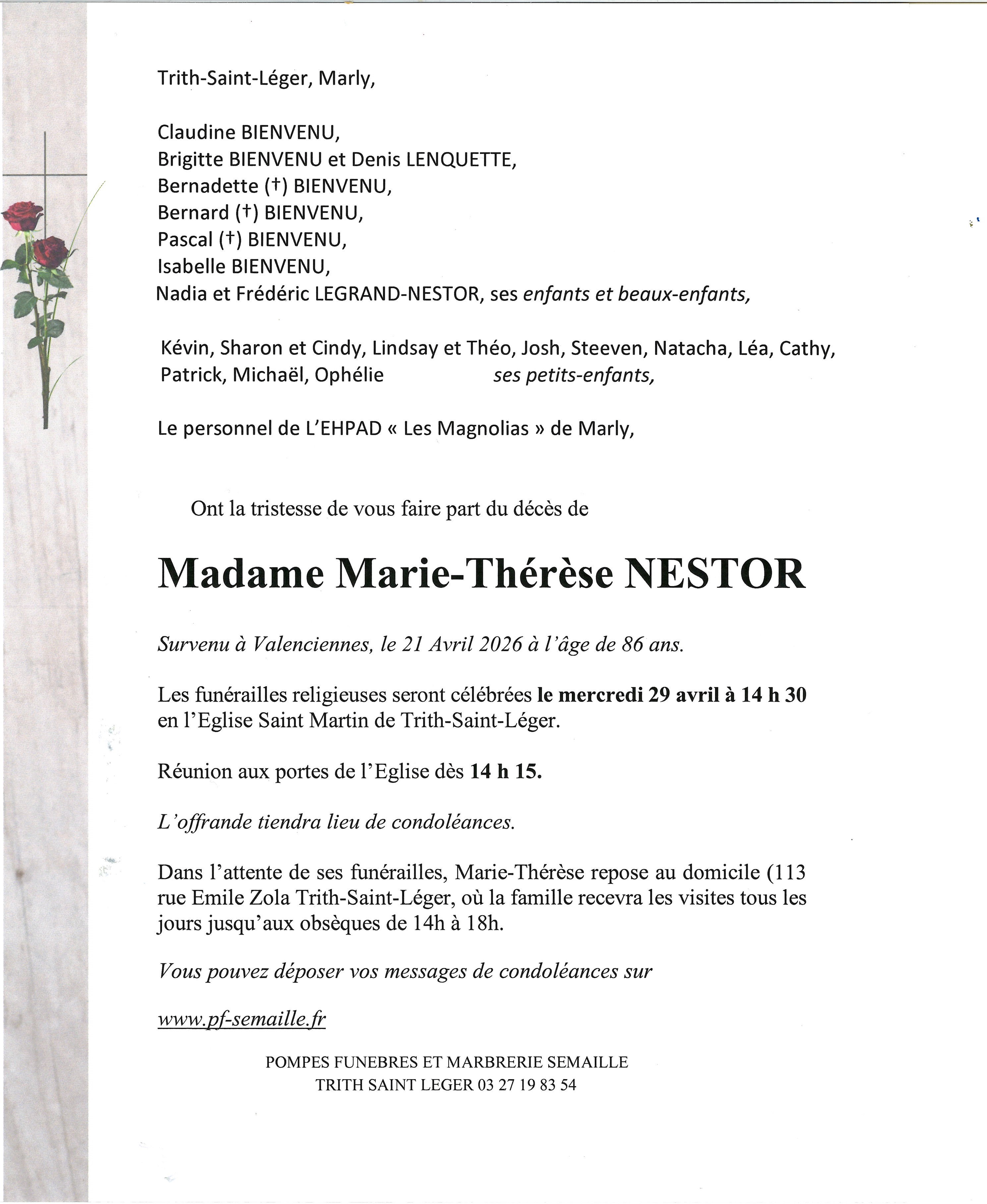 Avis de décès de Madame Marie-Thérèse NESTOR
