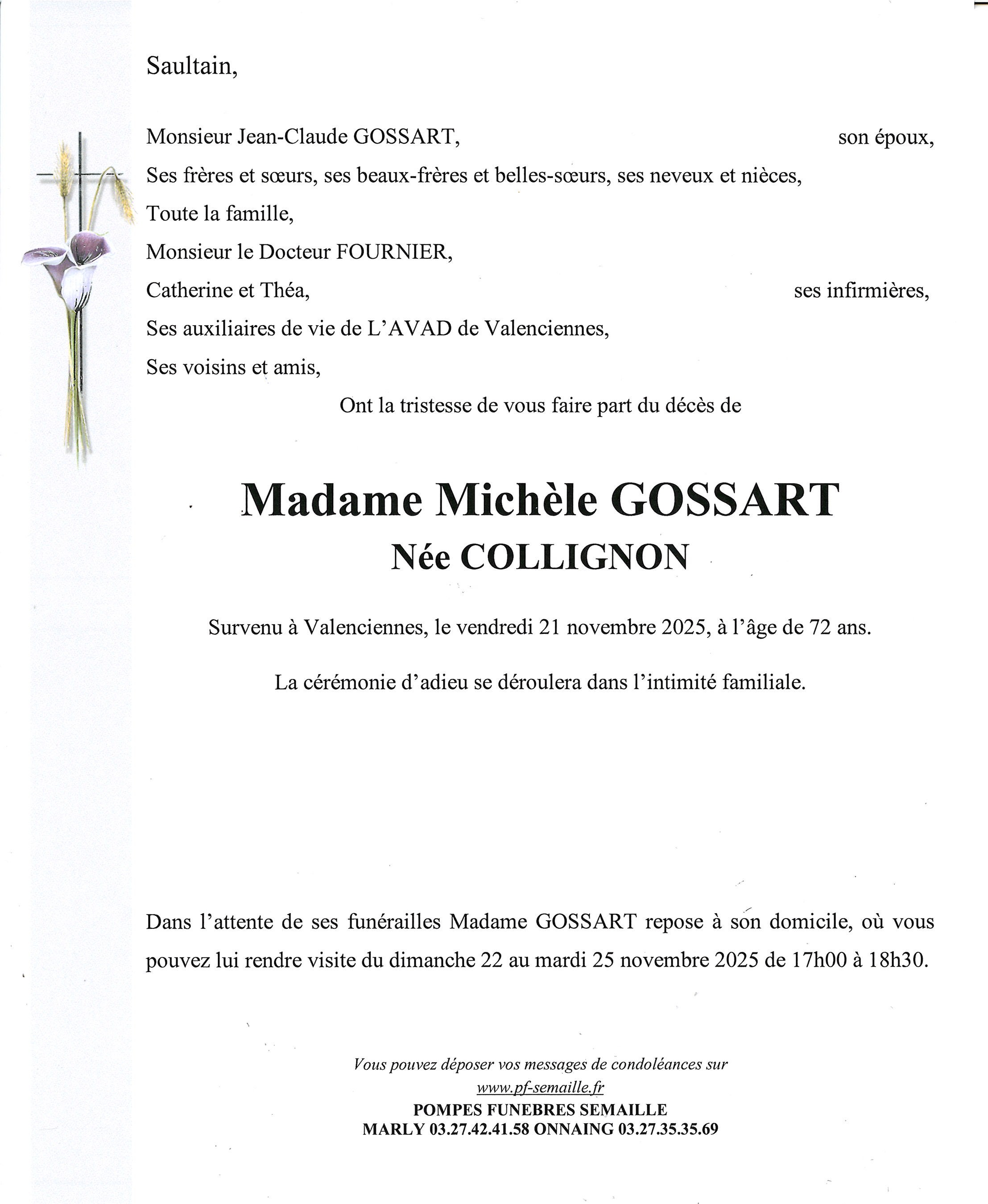 Avis de décès de Madame Michèle GOSSART née GOSSART