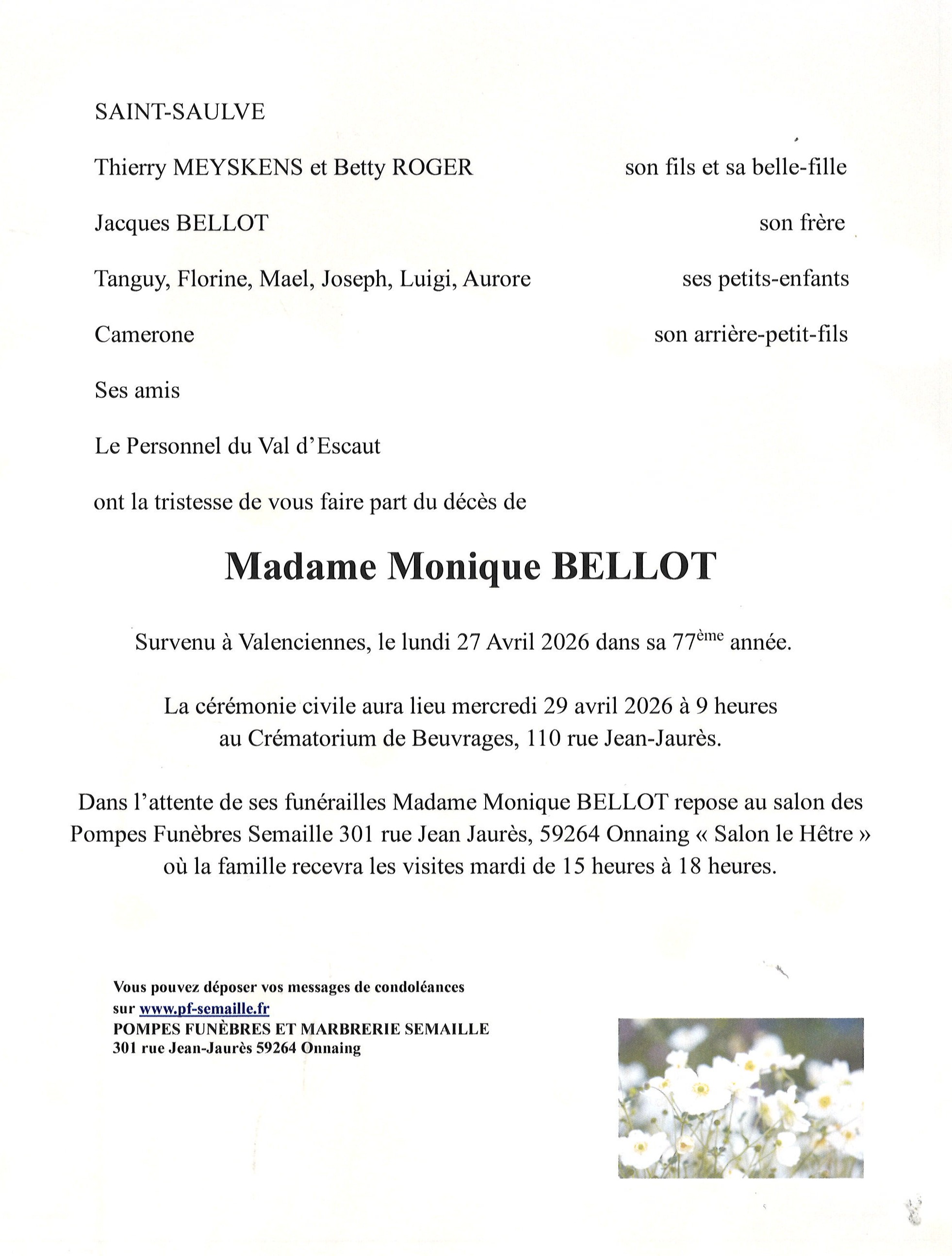 Avis de décès de Madame Monique BELLOT
