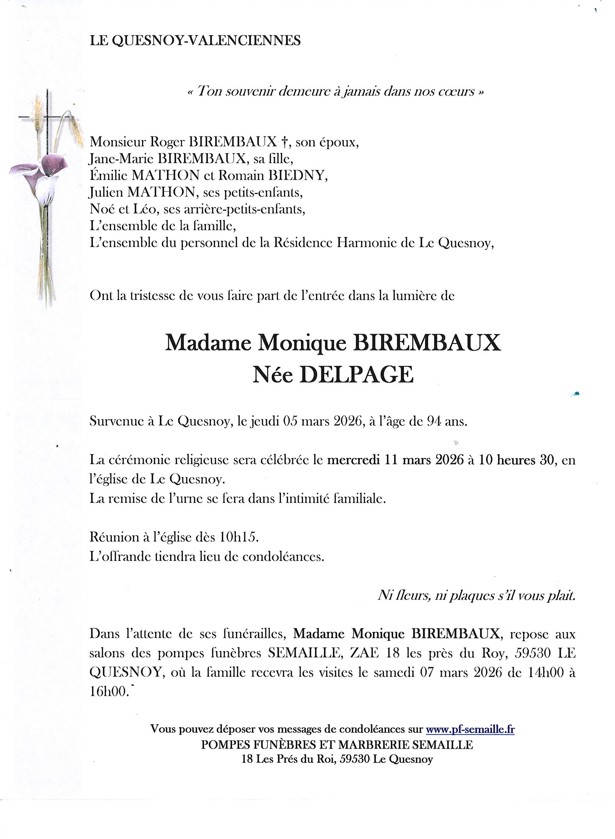 Avis de décès de Madame Monique BIREMBAUX née DELPAGE