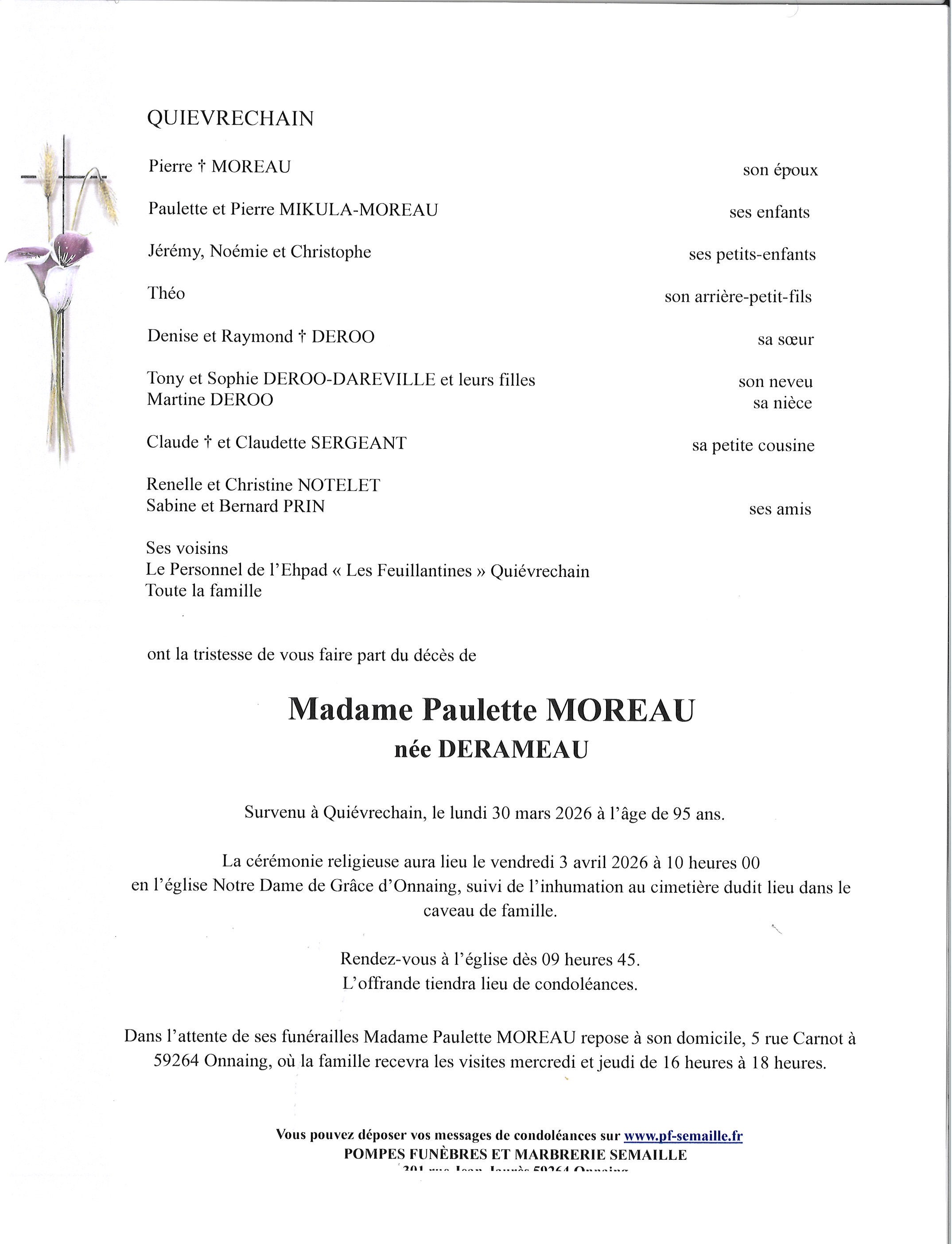 Avis de décès de Madame MOREAU PAULETTE