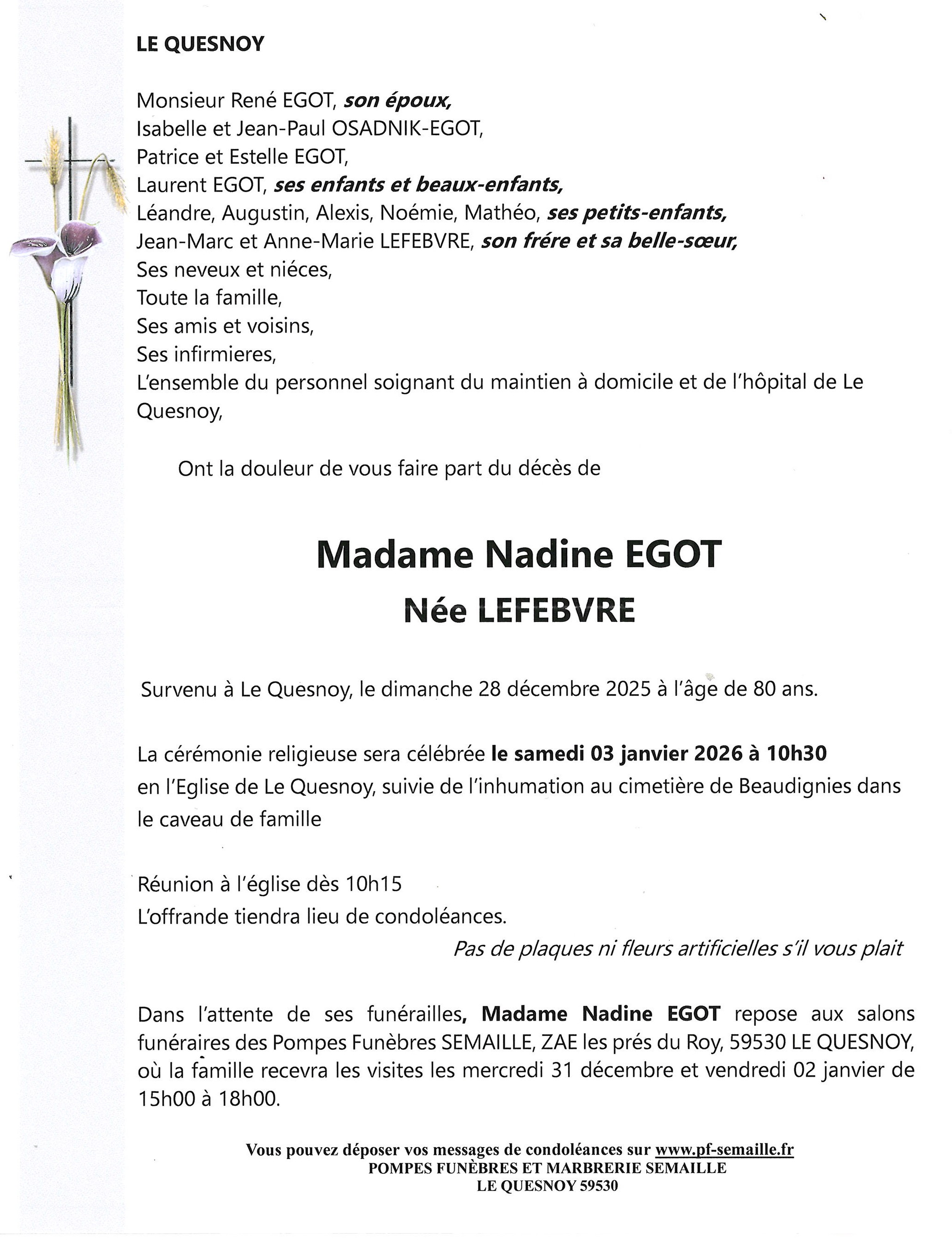 Avis de décès de Madame Nadine EGOT née LEFEBVRE