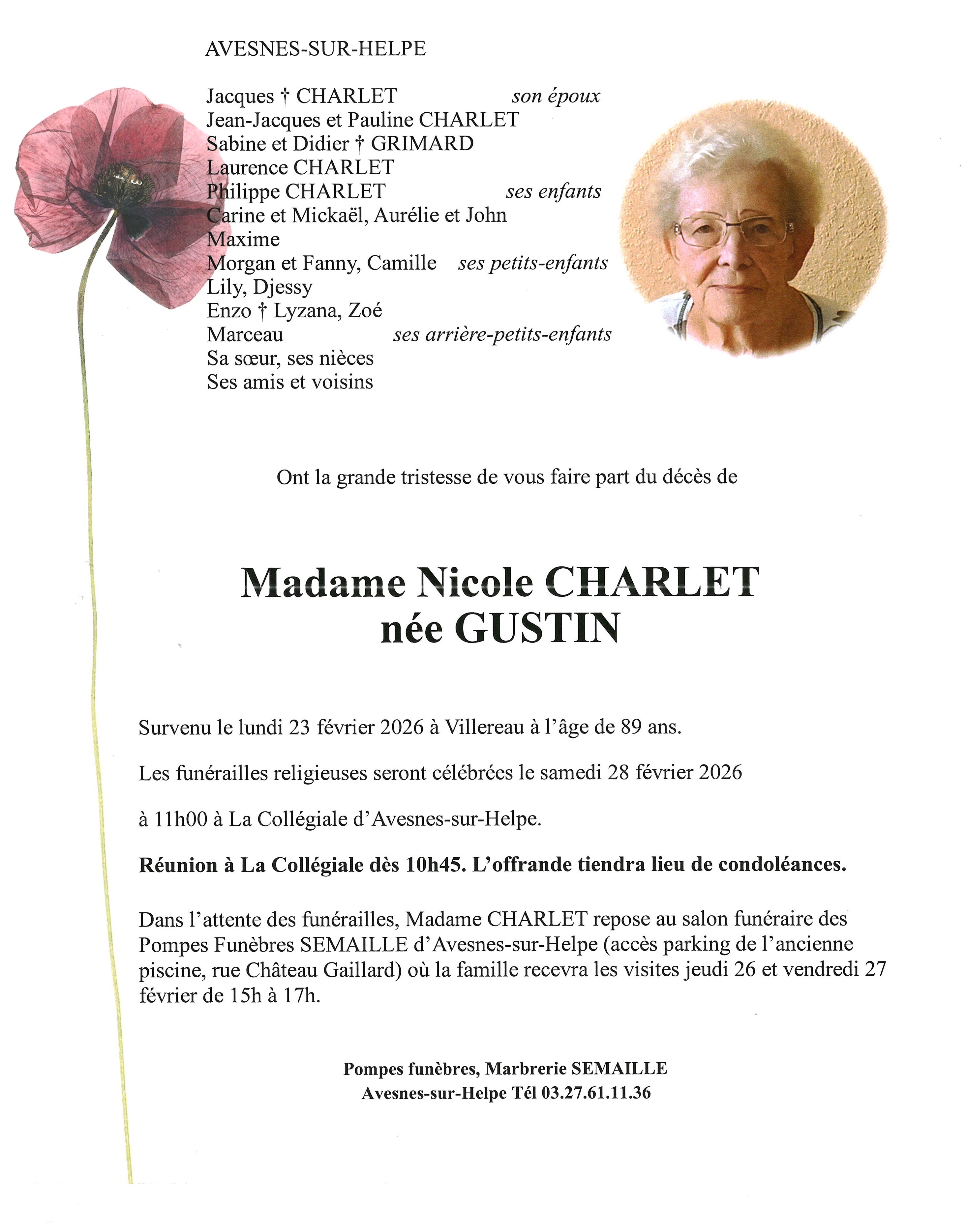 Cette page vous permet de présenter vos condoléances à la famille et de partager l'avis de décès de Nicole.